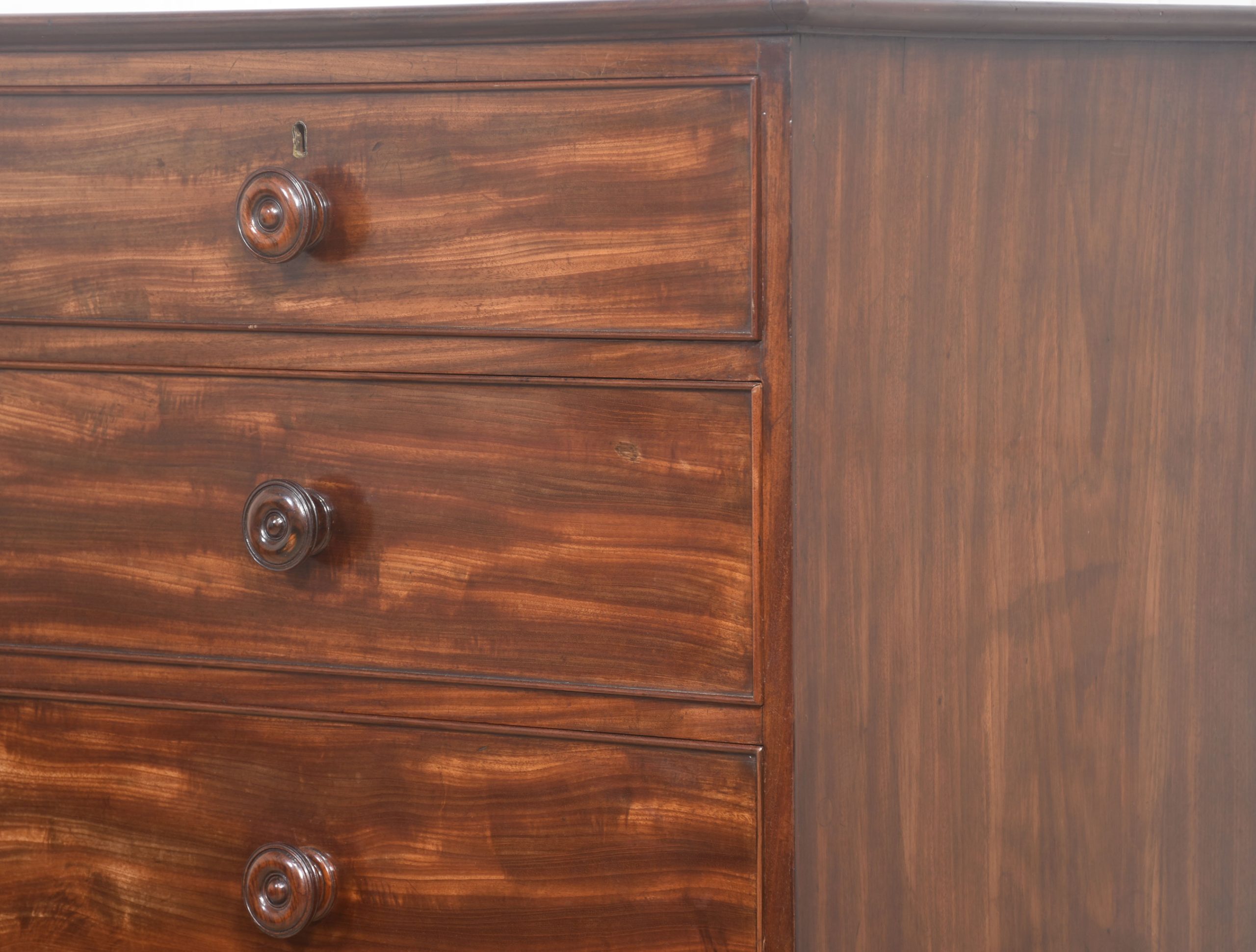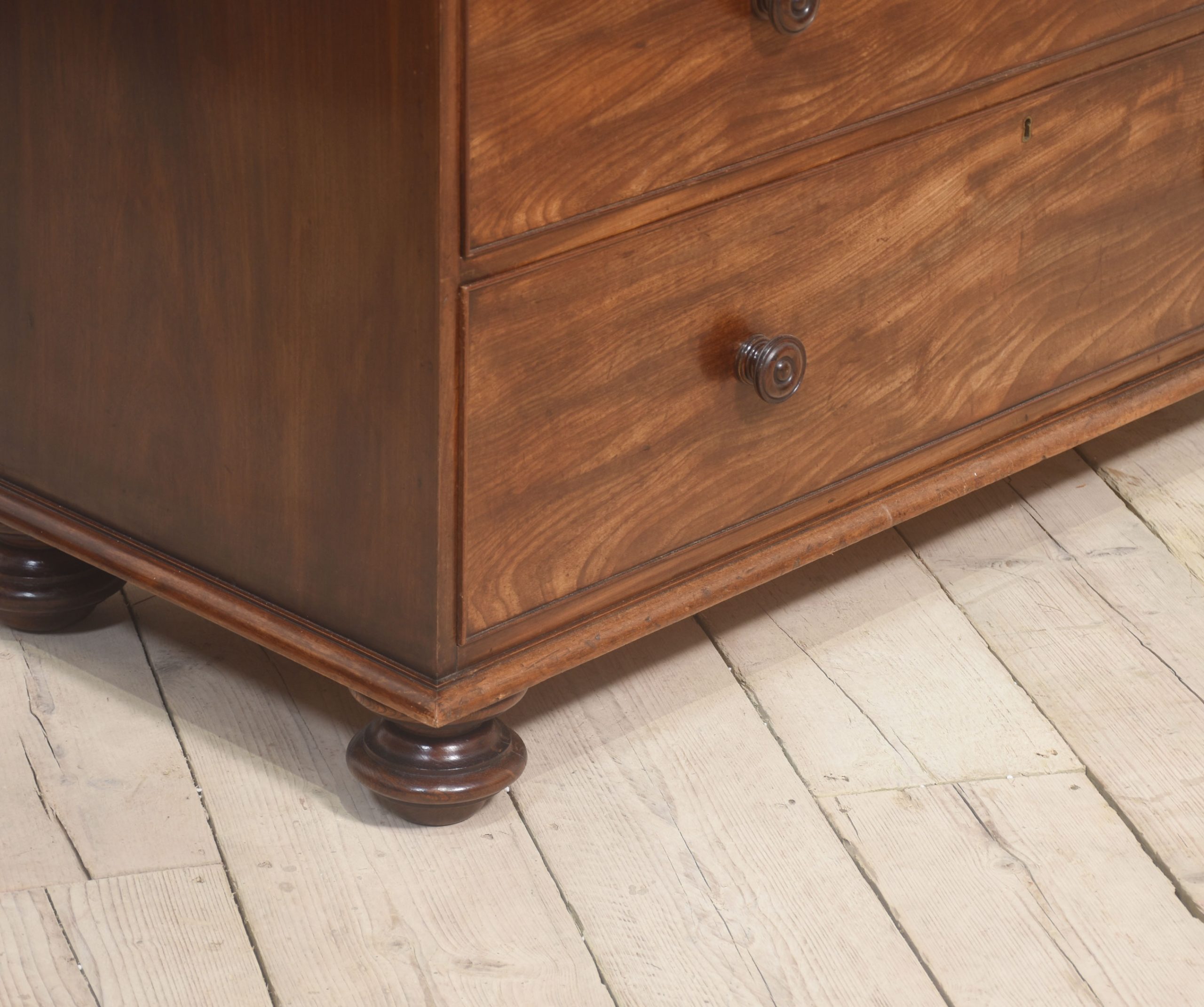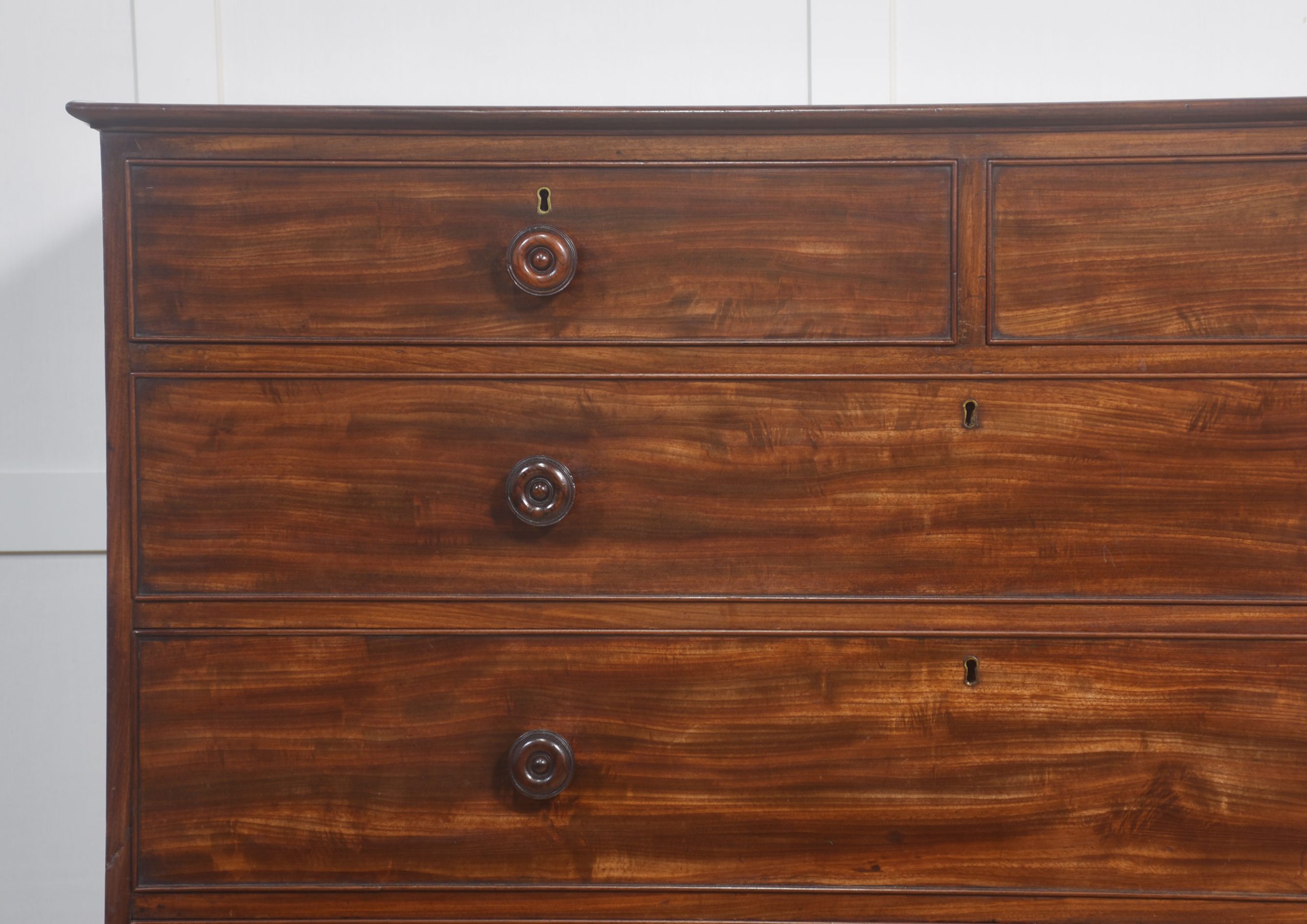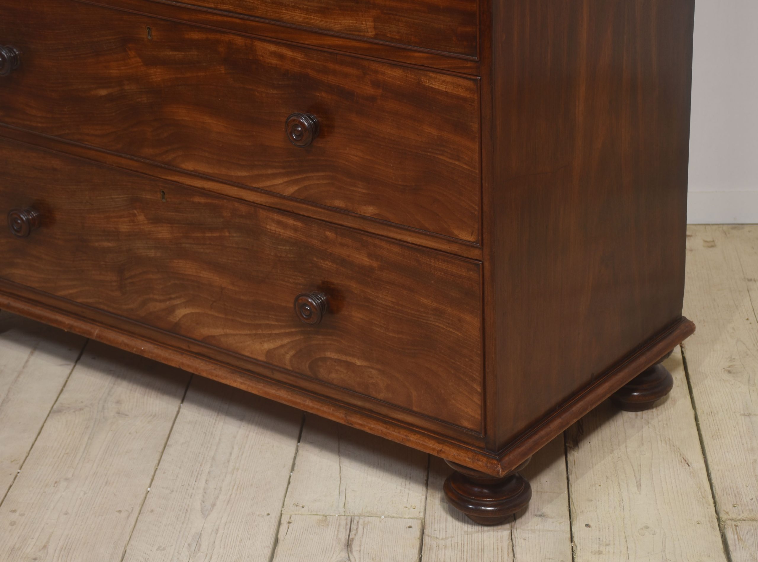 Tall mahogany chest of drawers, the rectangular top above two short and five long mahogany lined graduated drawers, all with turned mahogany knob handles. Raised up on bun feet.