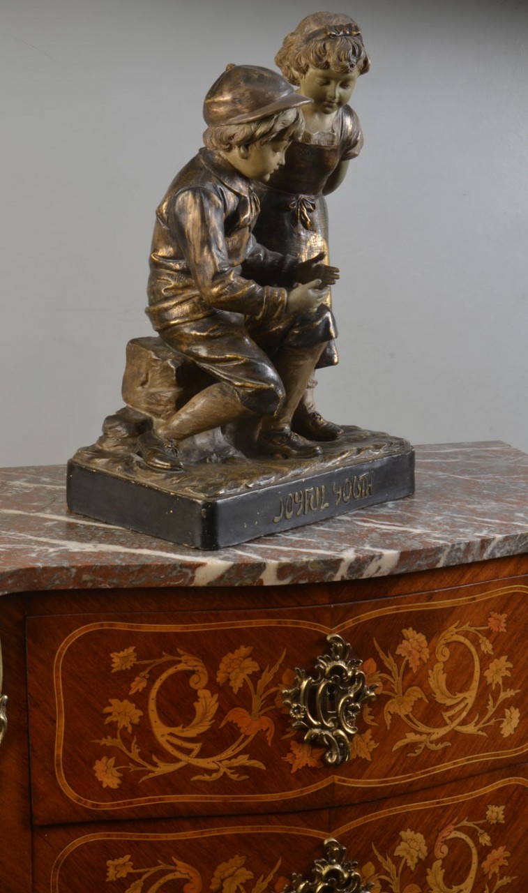 A figure of a two young children sat on a rock the boy with a hat wearing traditional dress the girl having a hair band also in traditional dress marked fritz kochendörfer to the reverse,