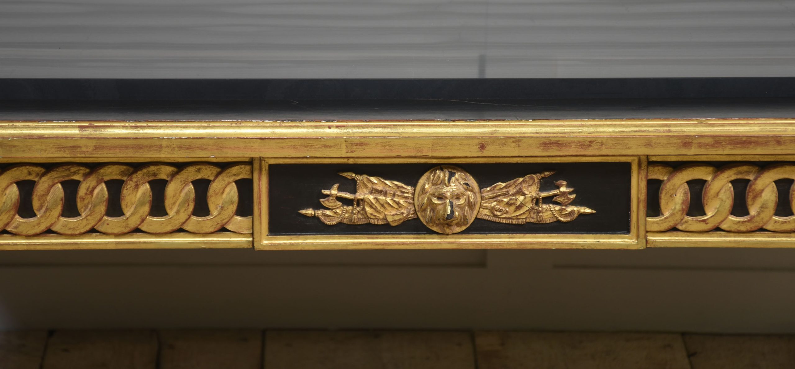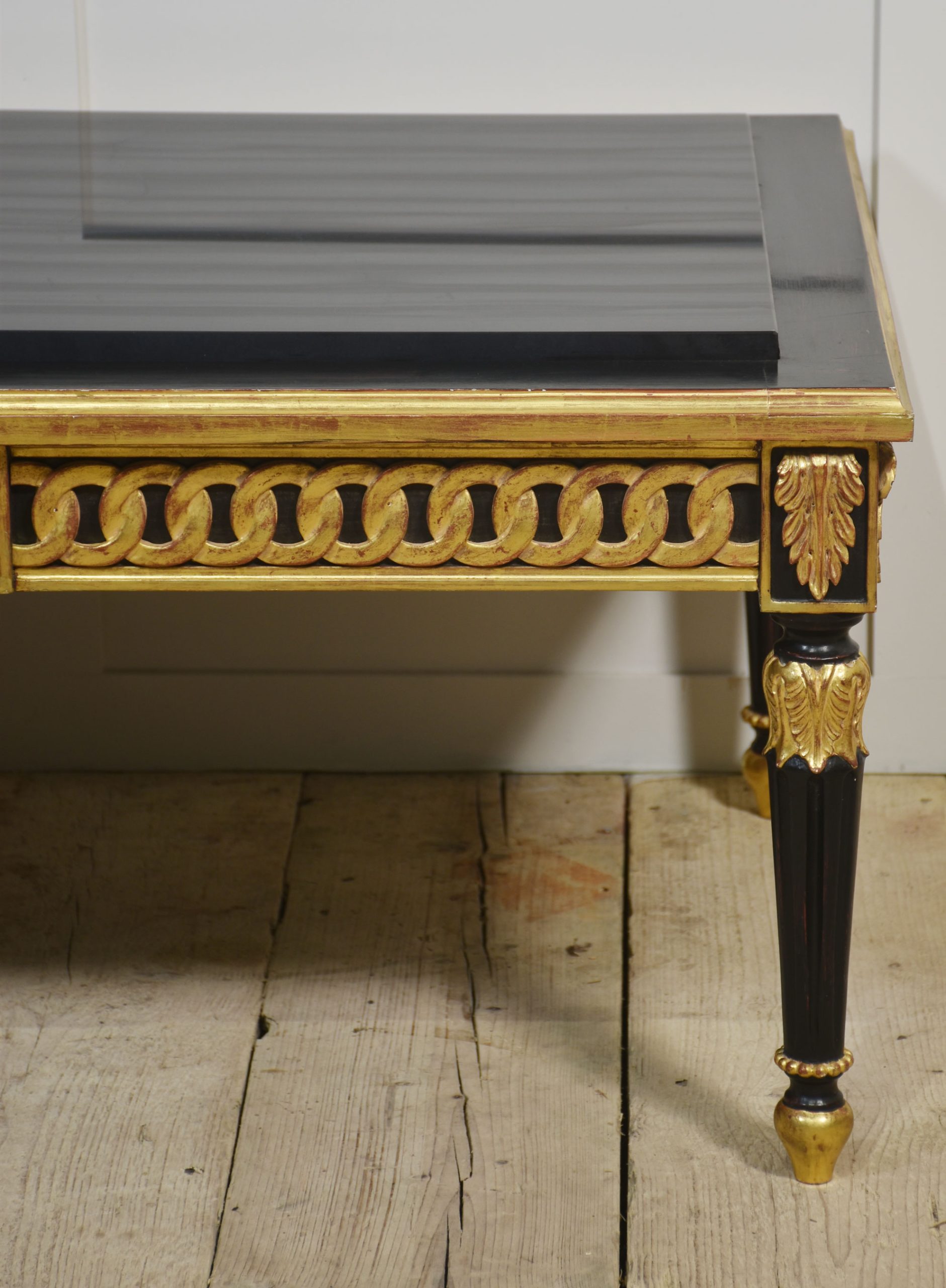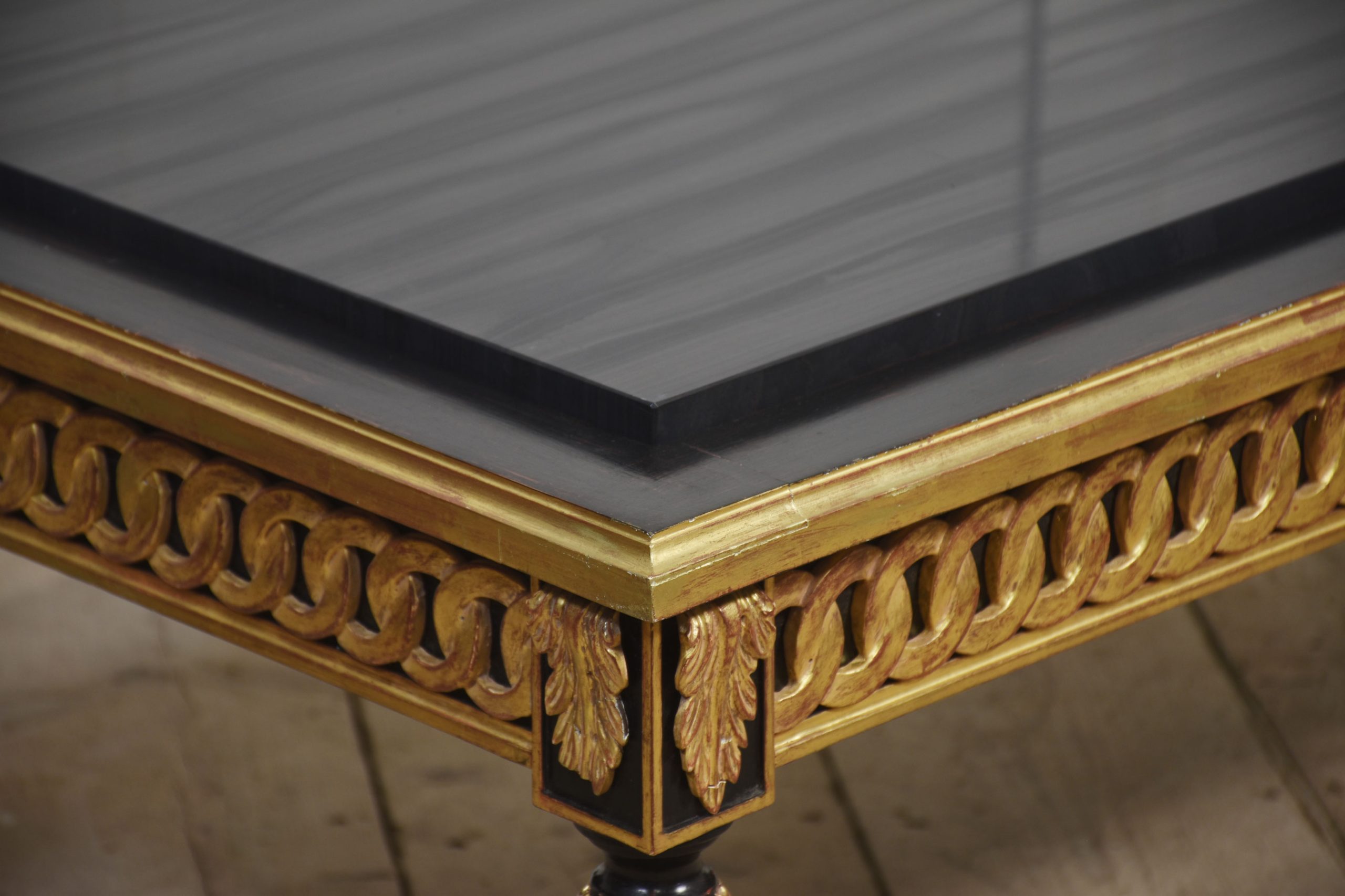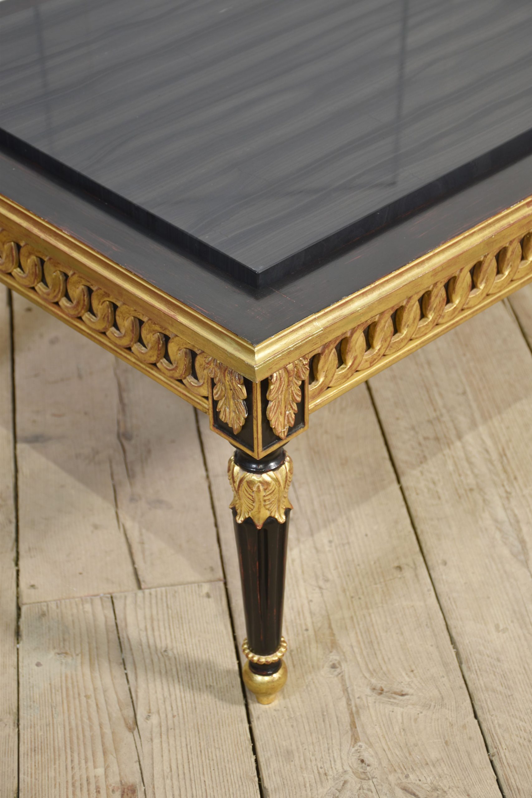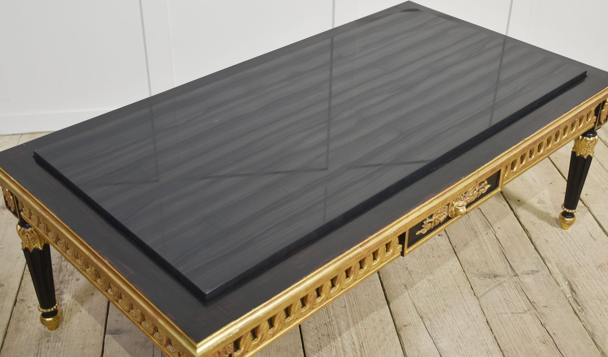 Venetian style coffee table, the large rectangular black veined marble top above ebony and gilt painted base. All raised up on turned reeded tapering legs.