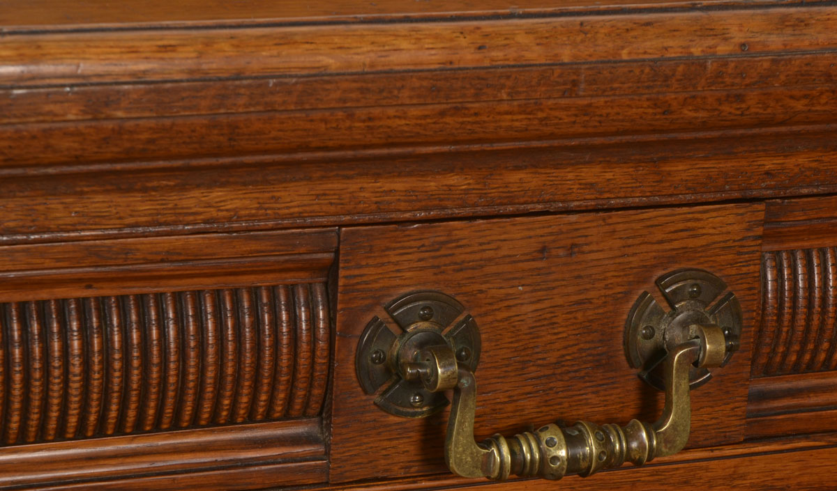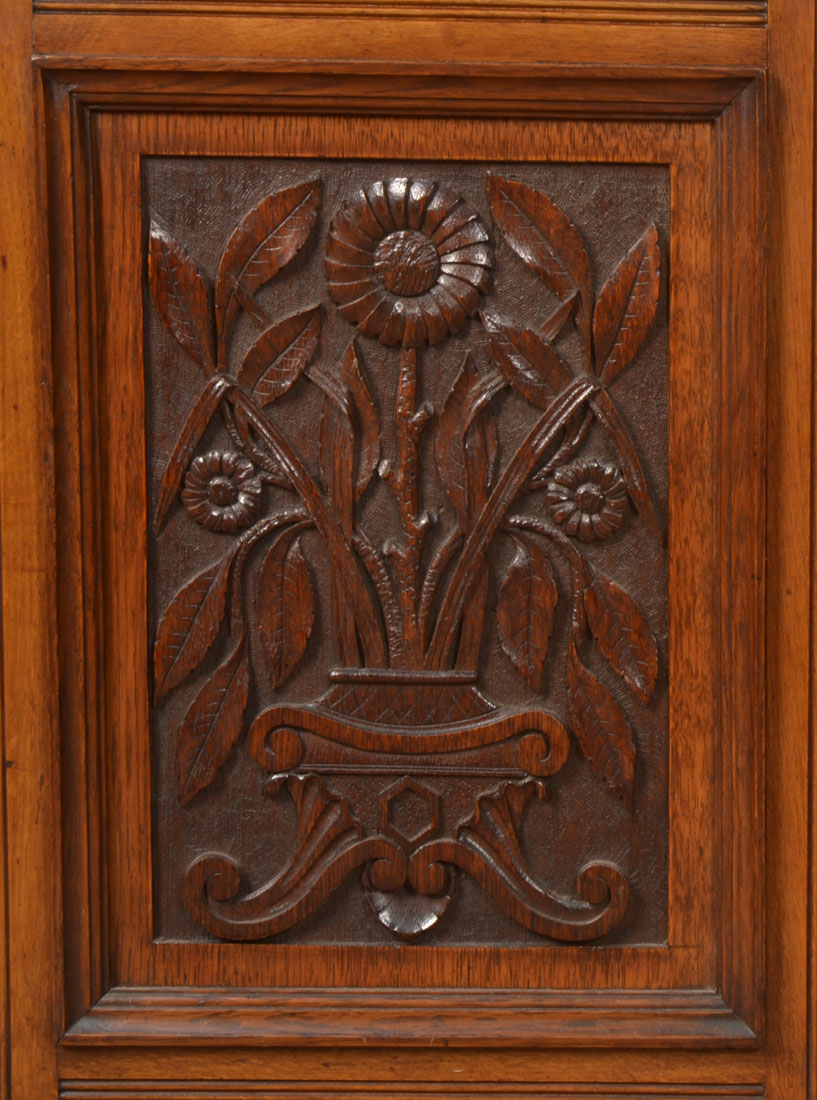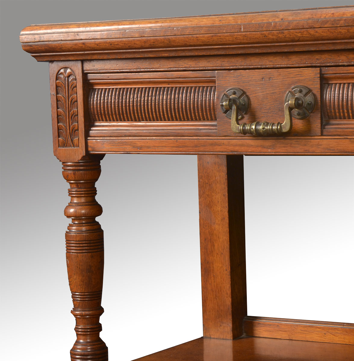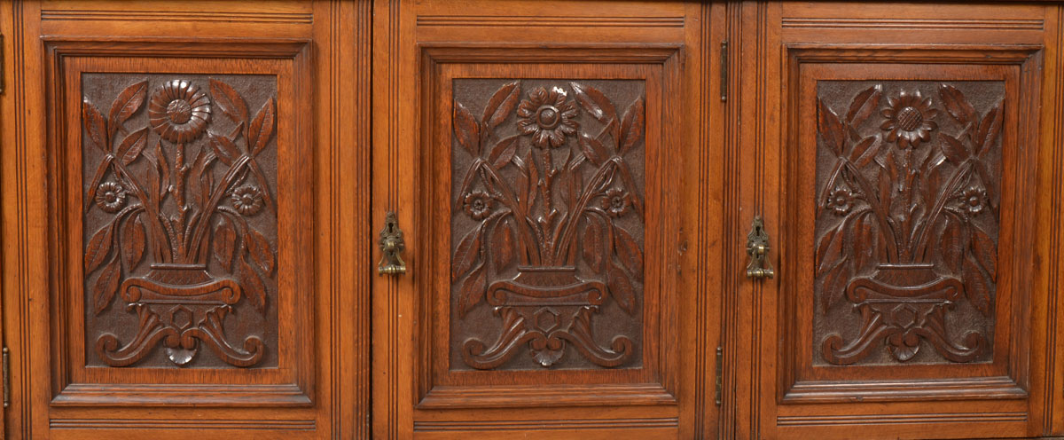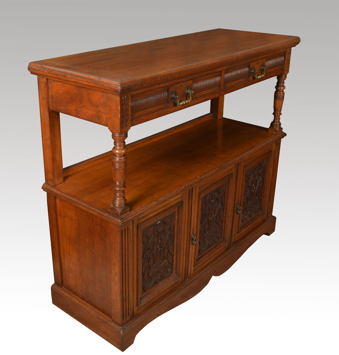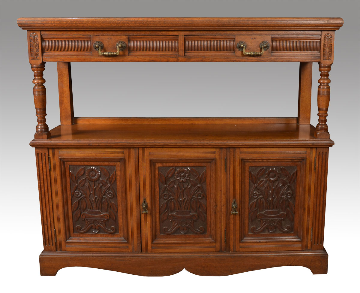 Product Description Victorian oak Buffet fitted a pair of drawers above a shelf with three floral carved panelled doors below