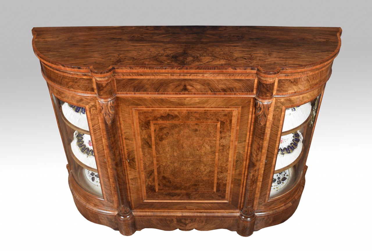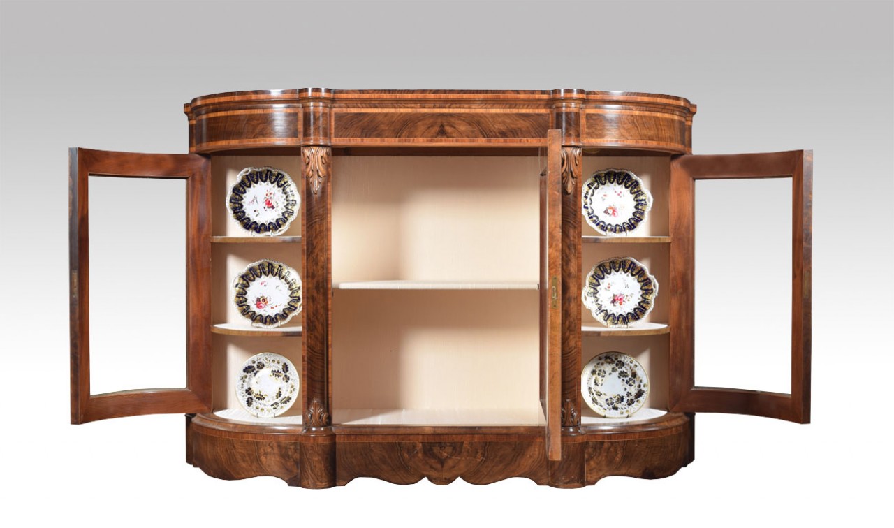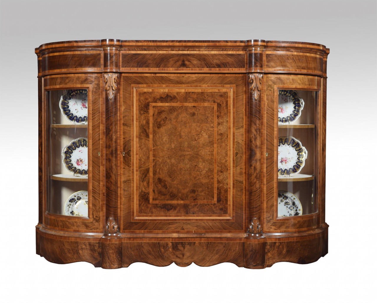 Victorian walnut and kingwood crossbanded credenza the shaped top above central cupboard door flanked by two bowed glazed doors enclosing upholstered shelved interior all raised up on shaped plinth base
