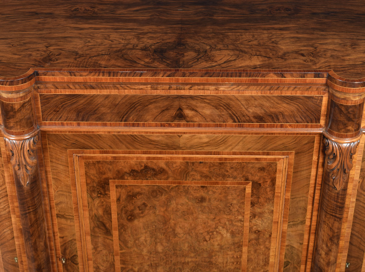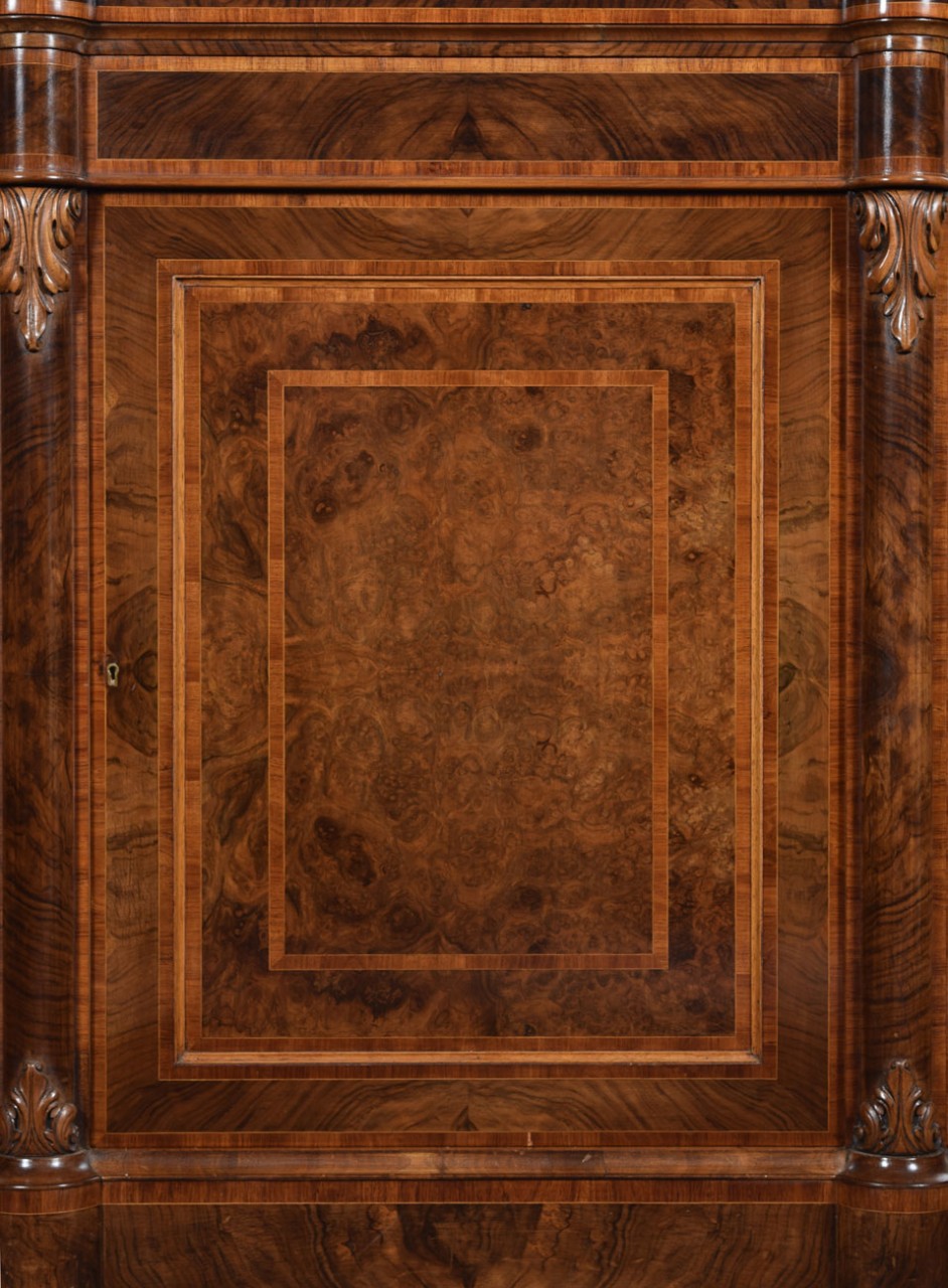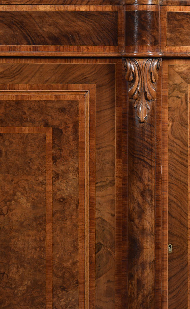 Victorian walnut and kingwood crossbanded credenza the shaped top above central cupboard door flanked by two bowed glazed doors enclosing upholstered shelved interior all raised up on shaped plinth base
