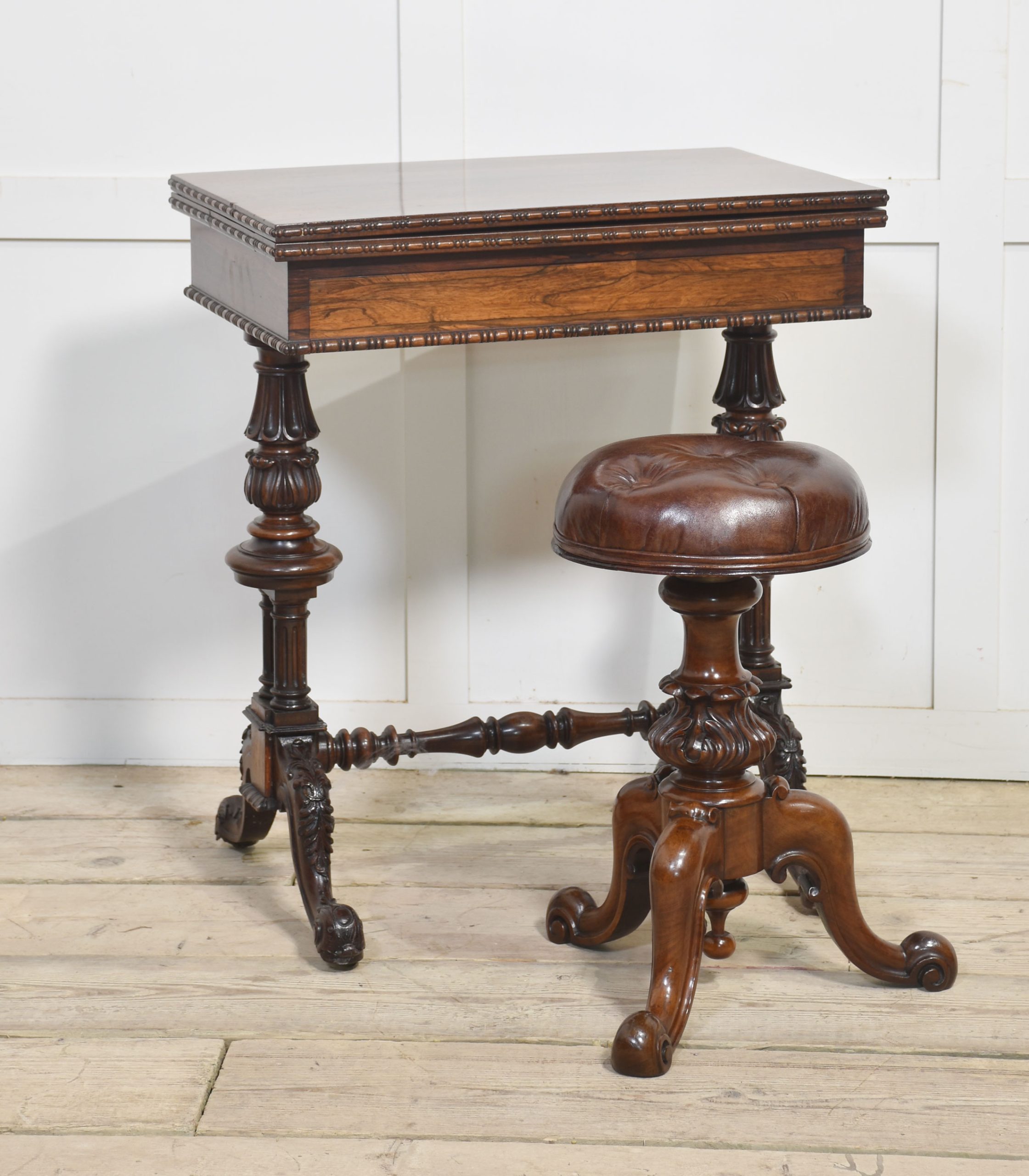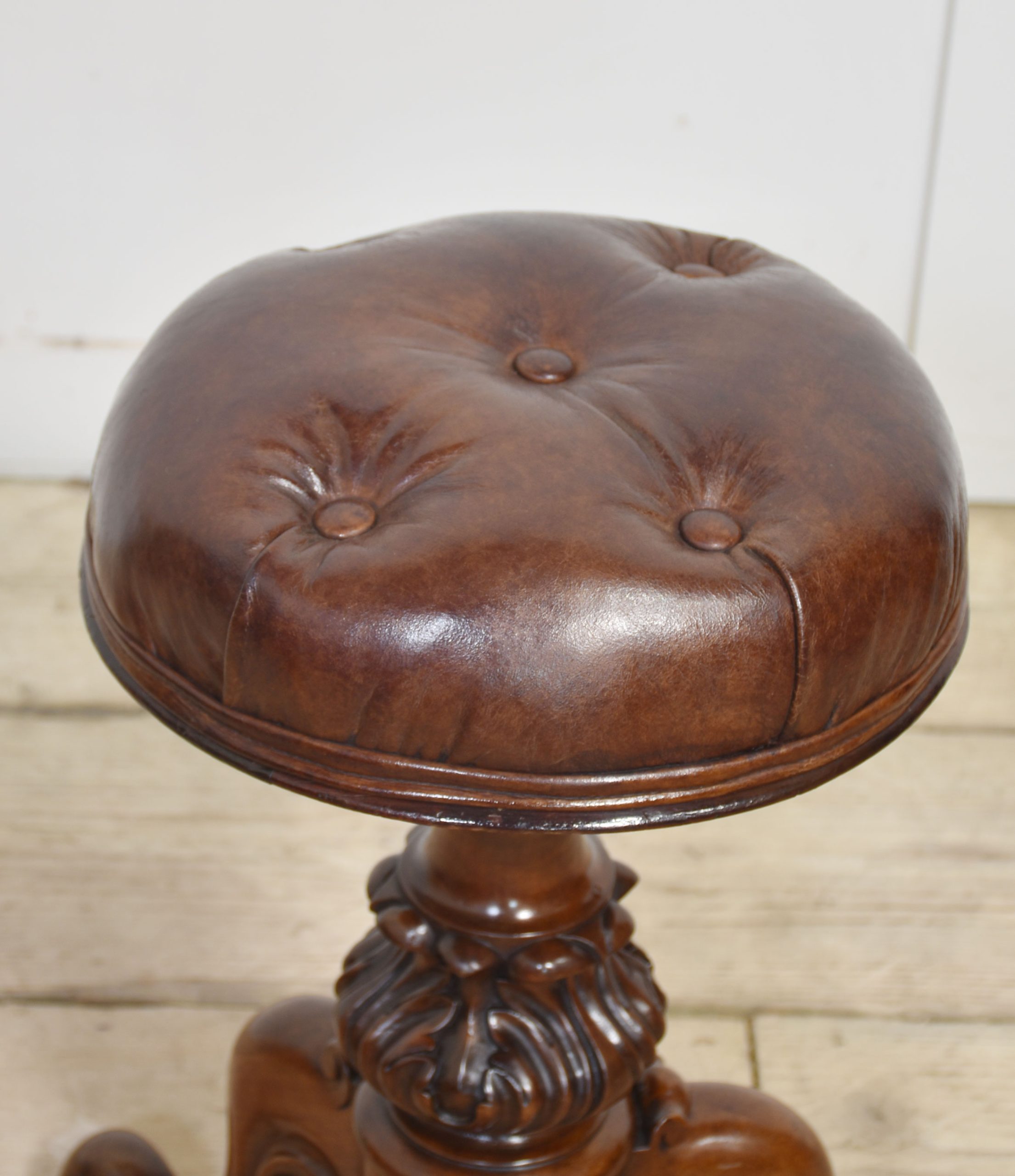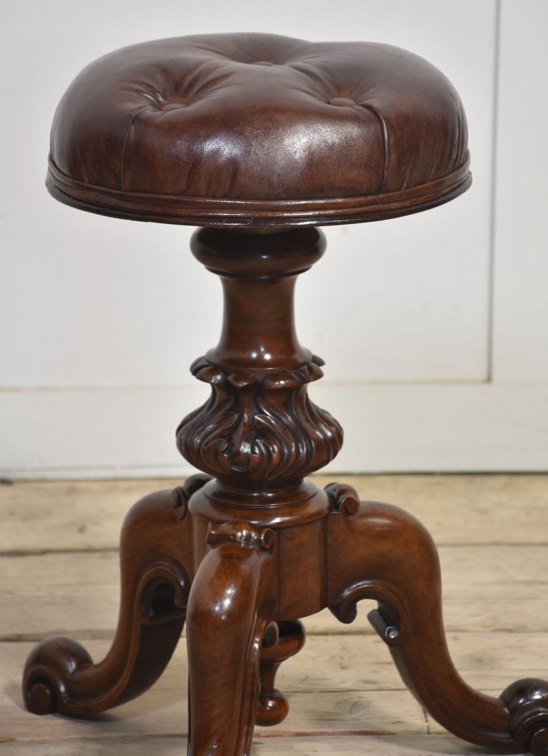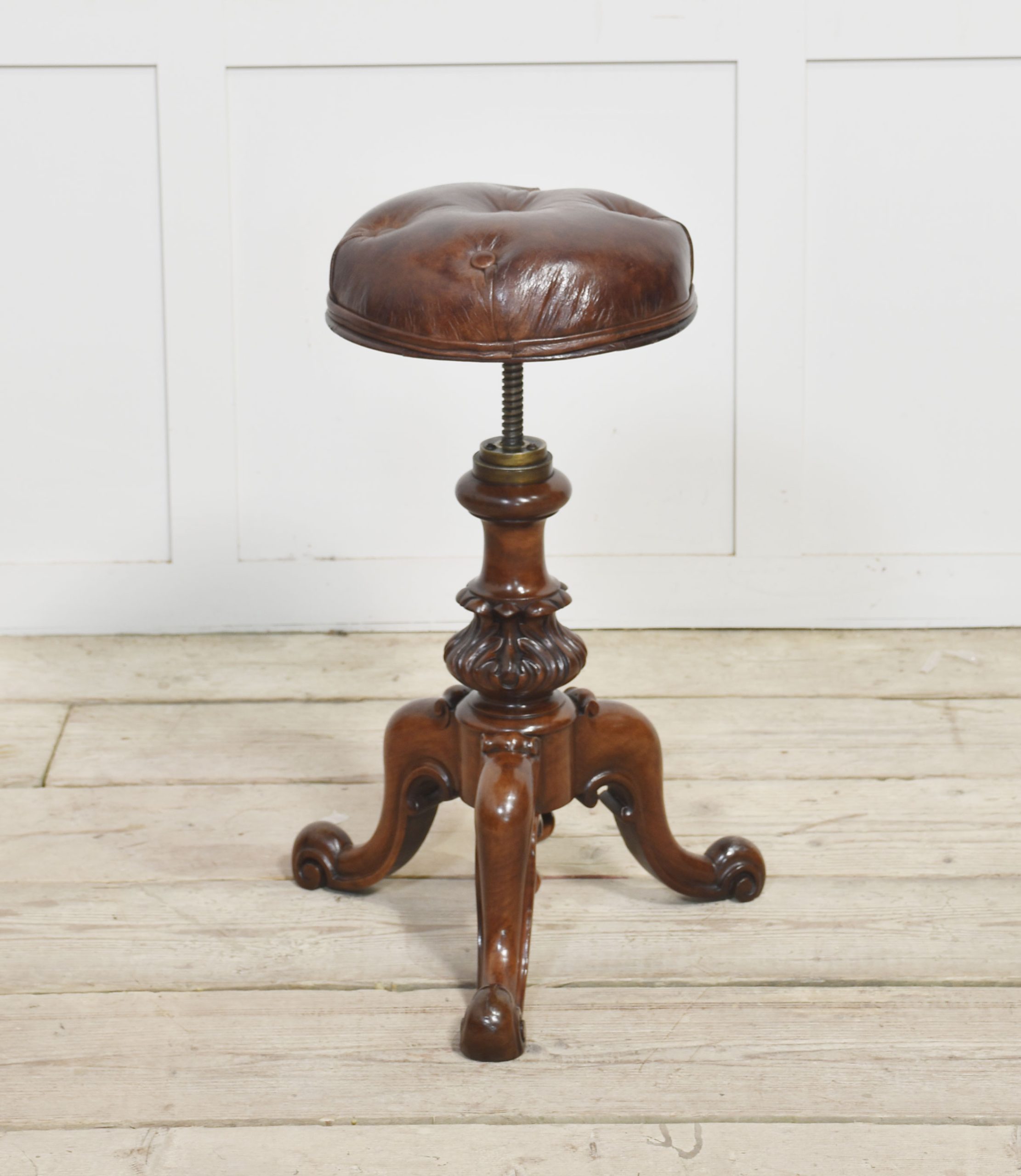 Walnut adjustable piano stool with leather upholstered seat above turned central carved column, all raised up on scroll cabriole legs.