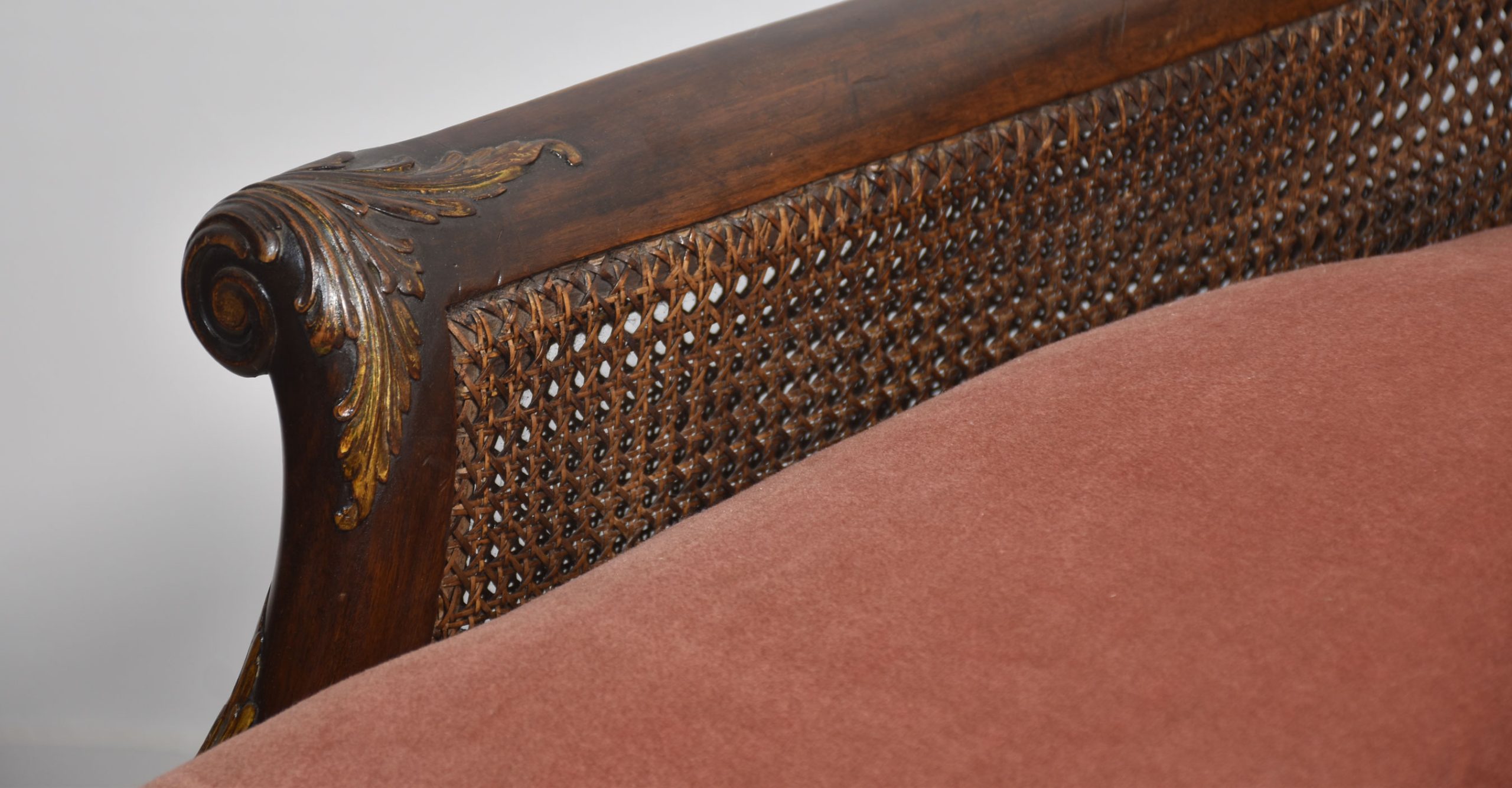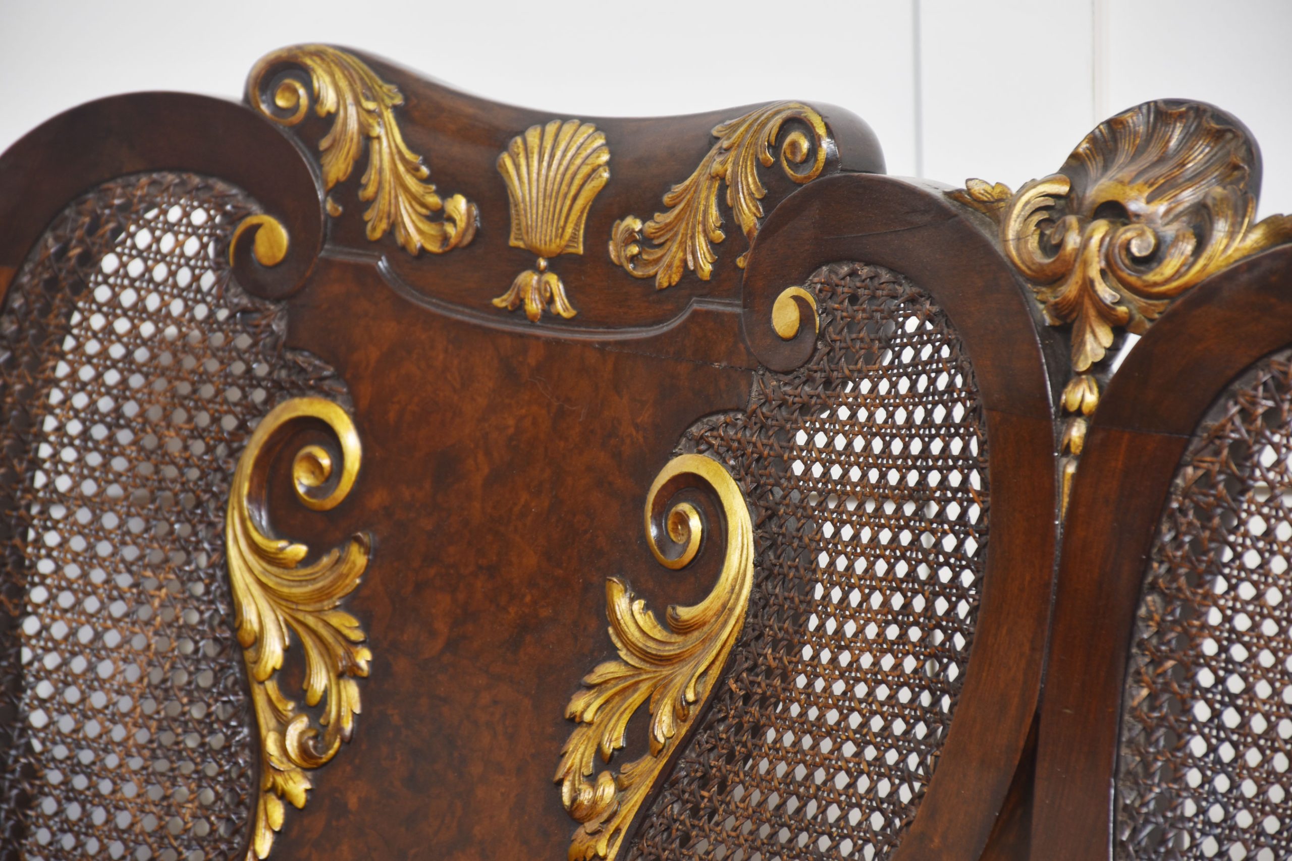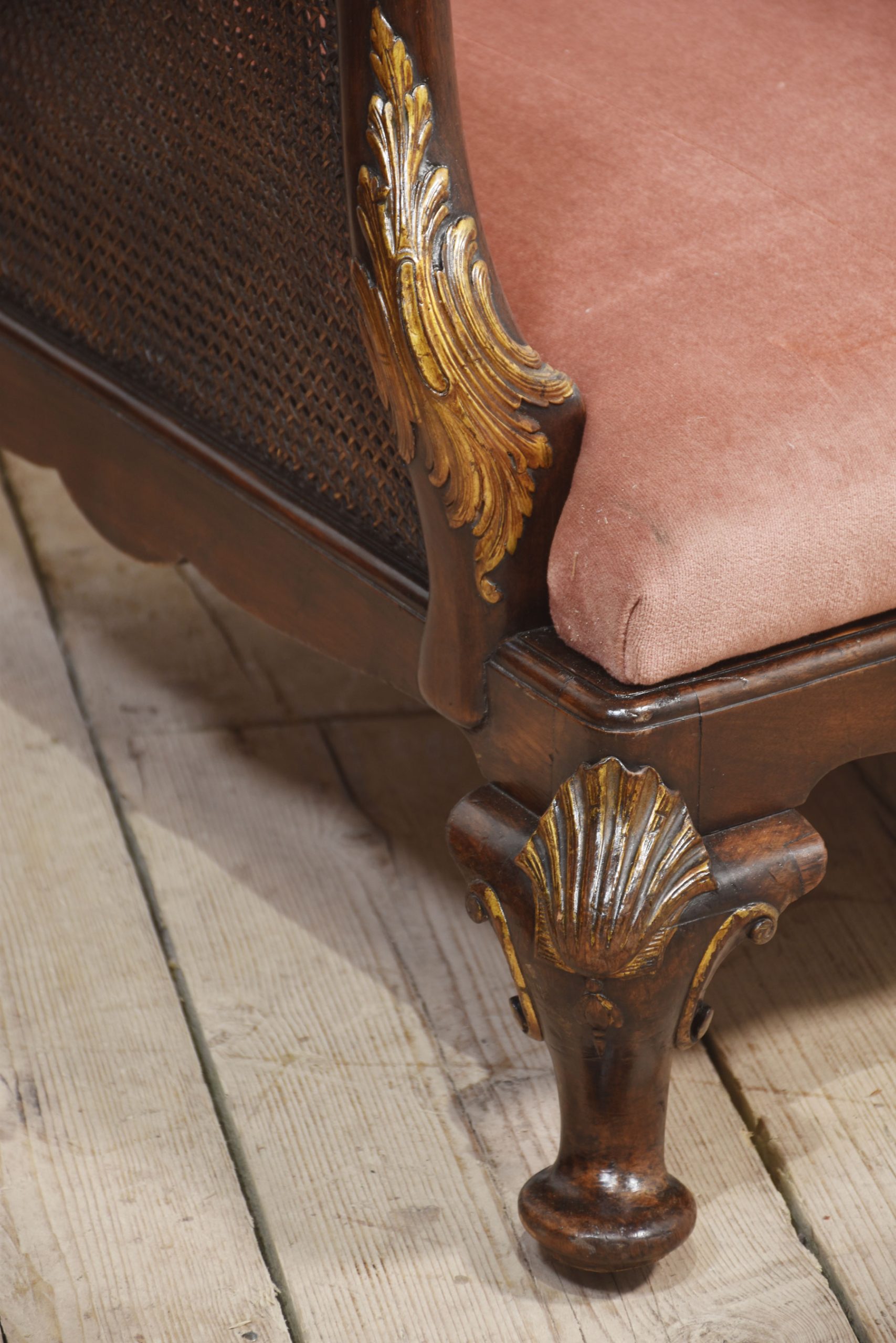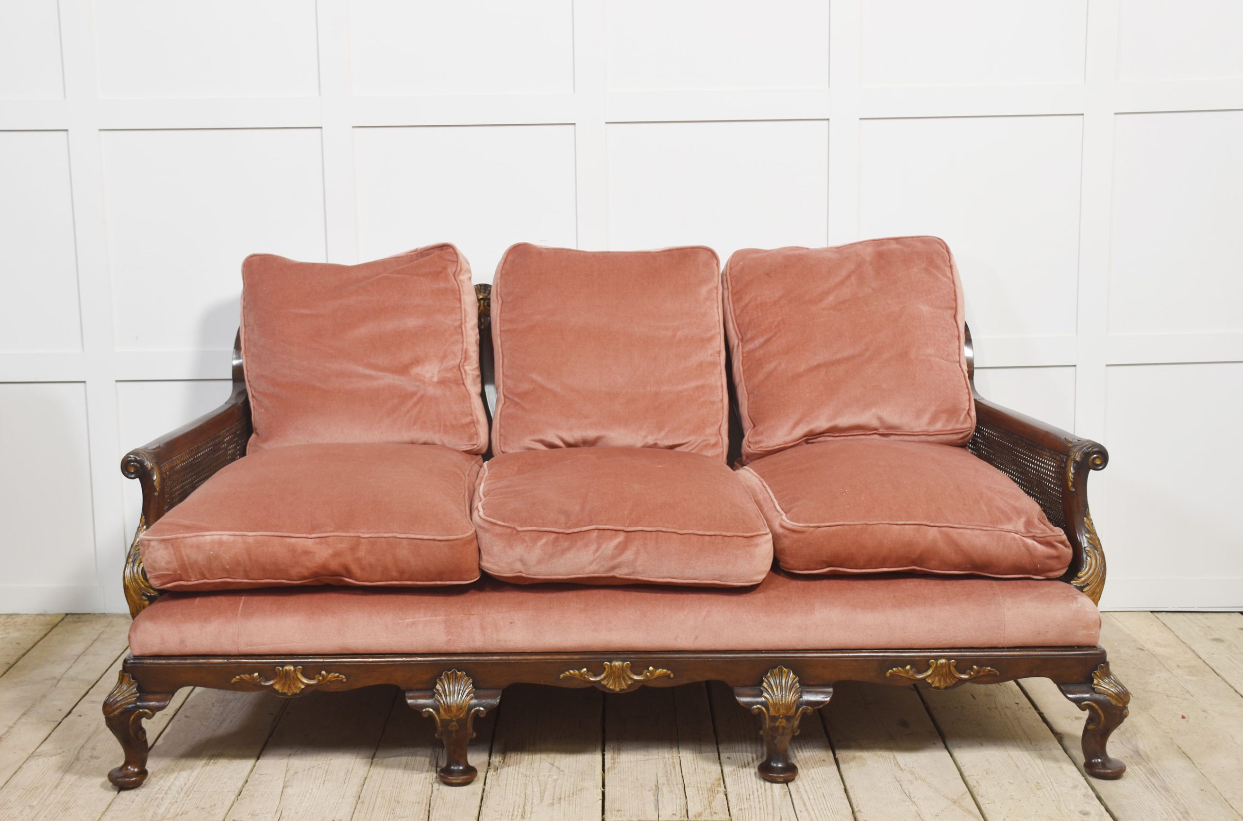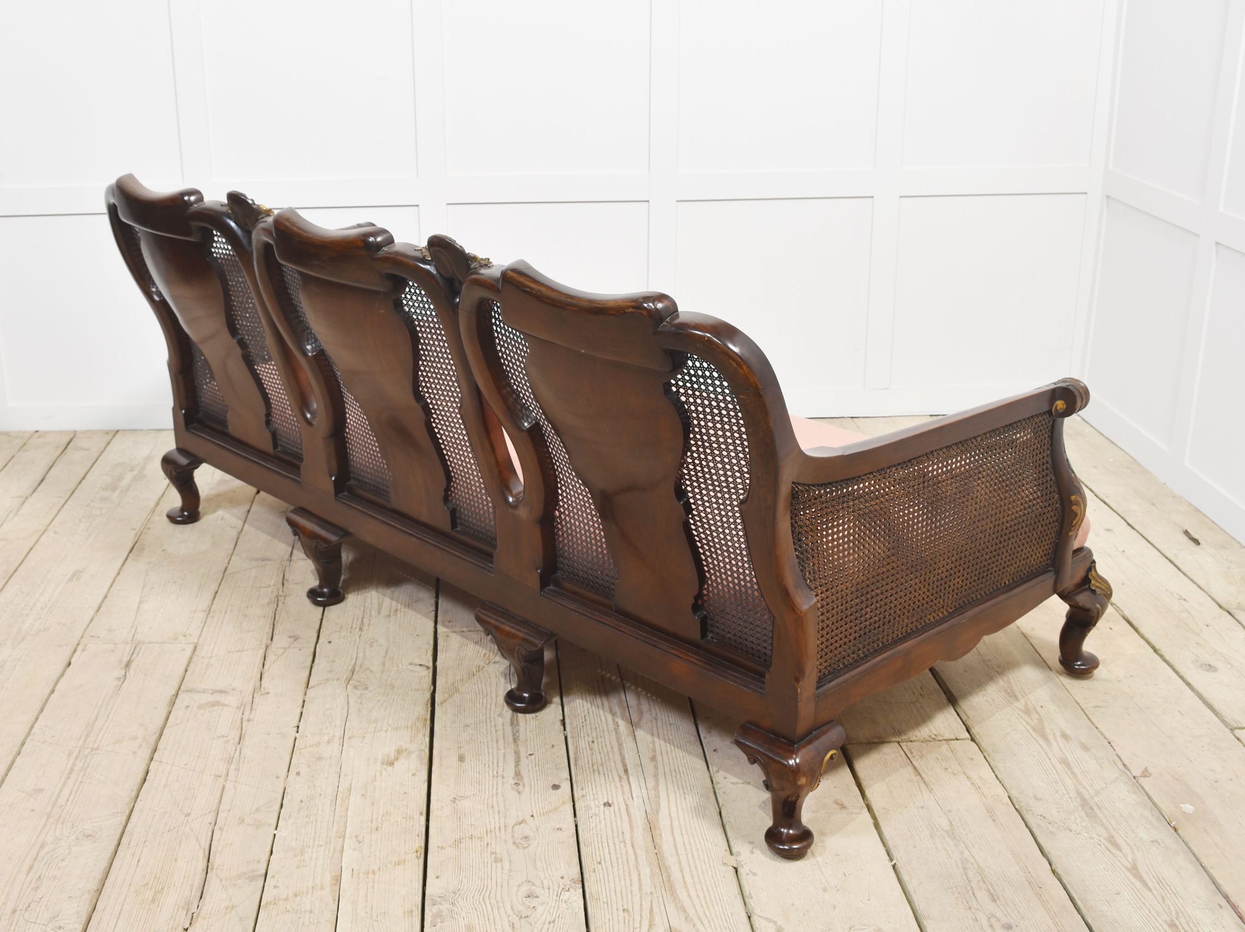 Walnut Bergere three seater sofa, the shaped back above three tracery carved vase-shaped splats, splats decorated with gilded moulded decoration, flanked double cane sides and scrolling arms. The upholstered seat with removable seat and back cushions standing on shell-caped cabriole legs termination in pad feet.