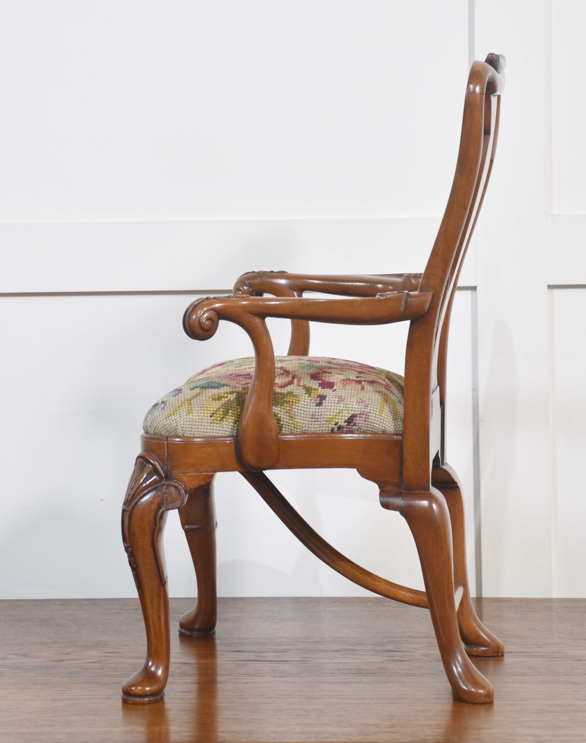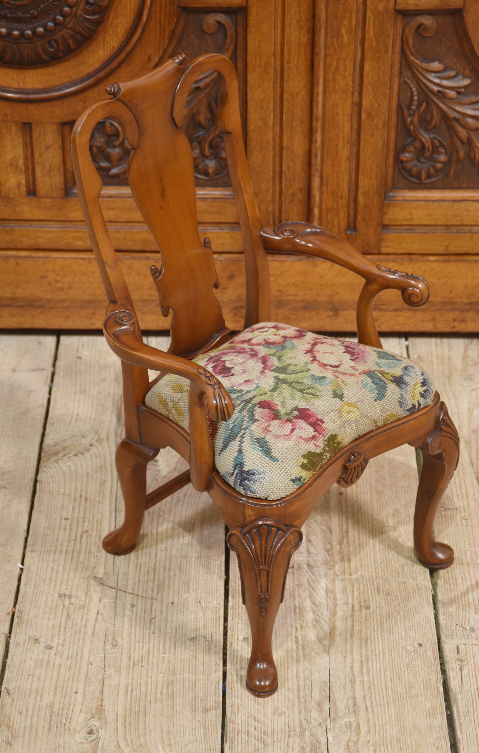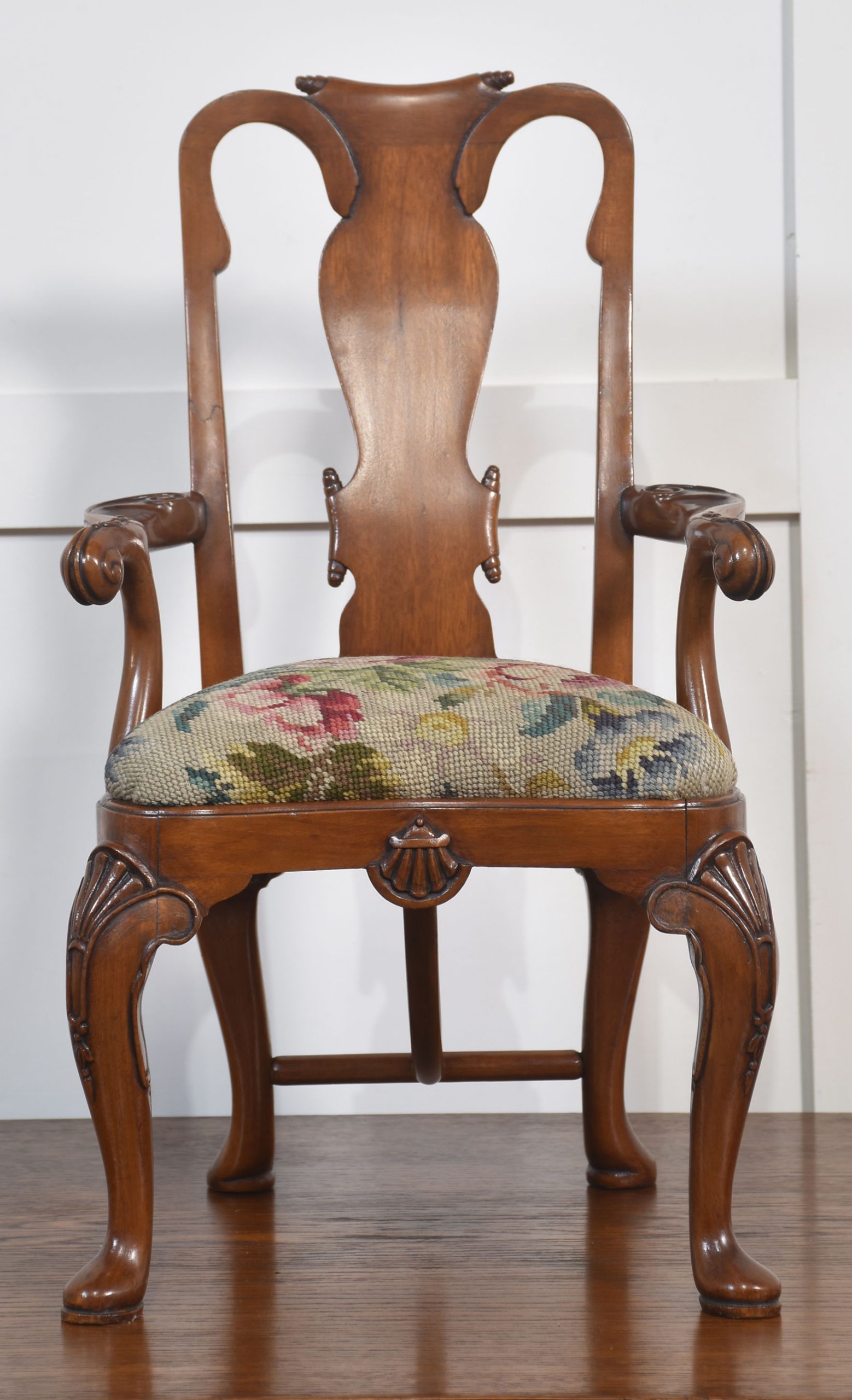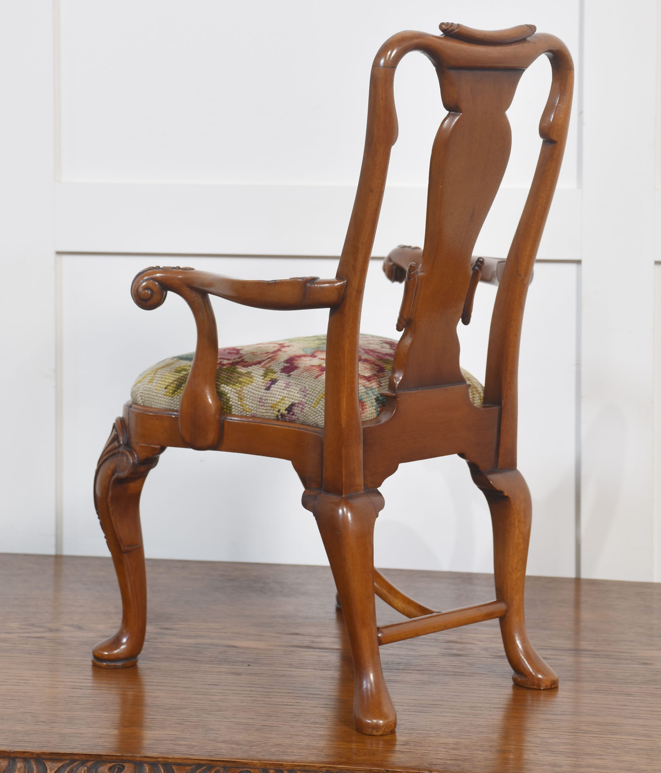 19th-century walnut child’s armchair the shaped back with a central splat to the needlepoint removable seat cushion, enclosed by outswept arms. All raised up on shell-capped carved cabriole legs terminating in pad feet.
