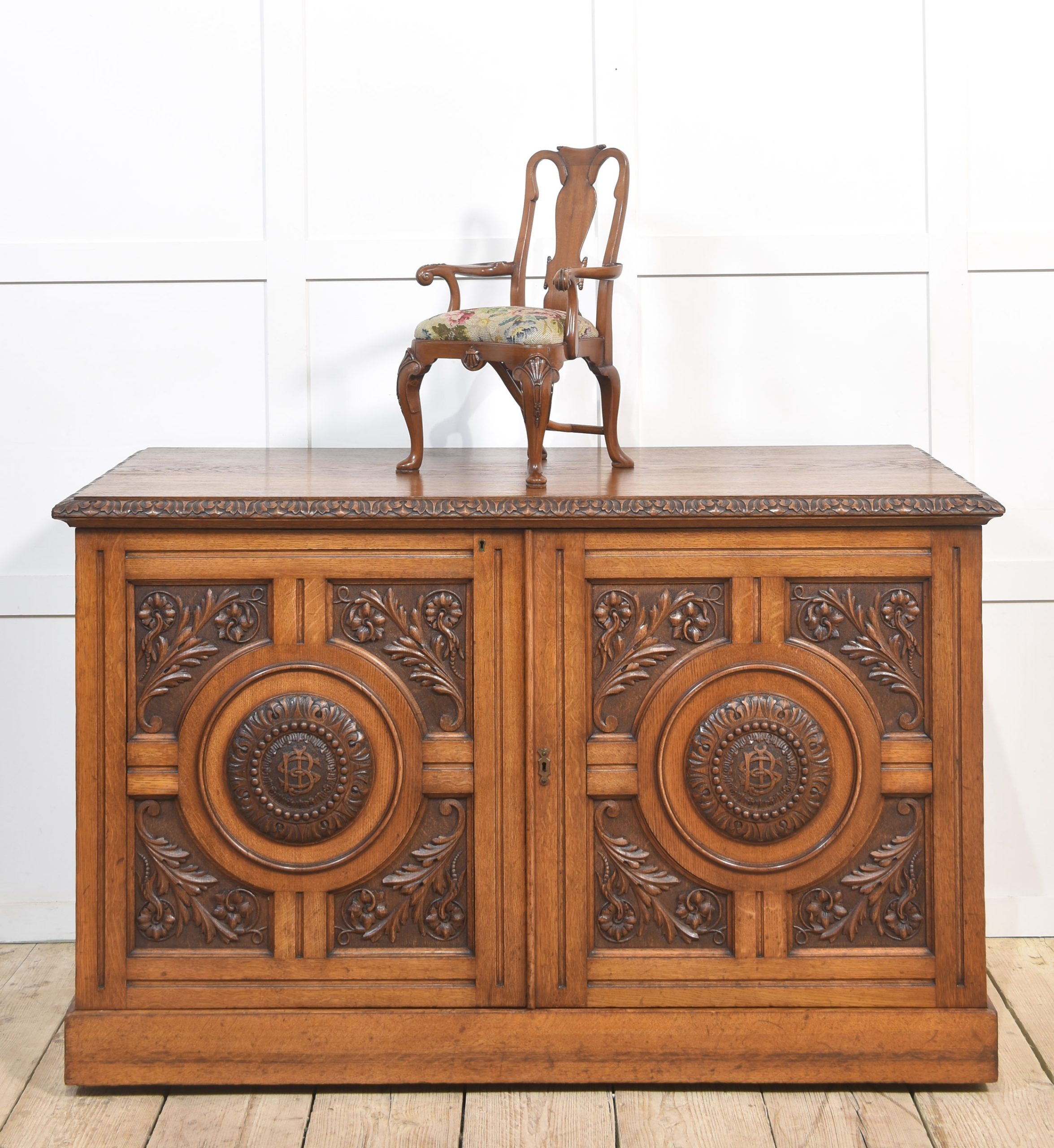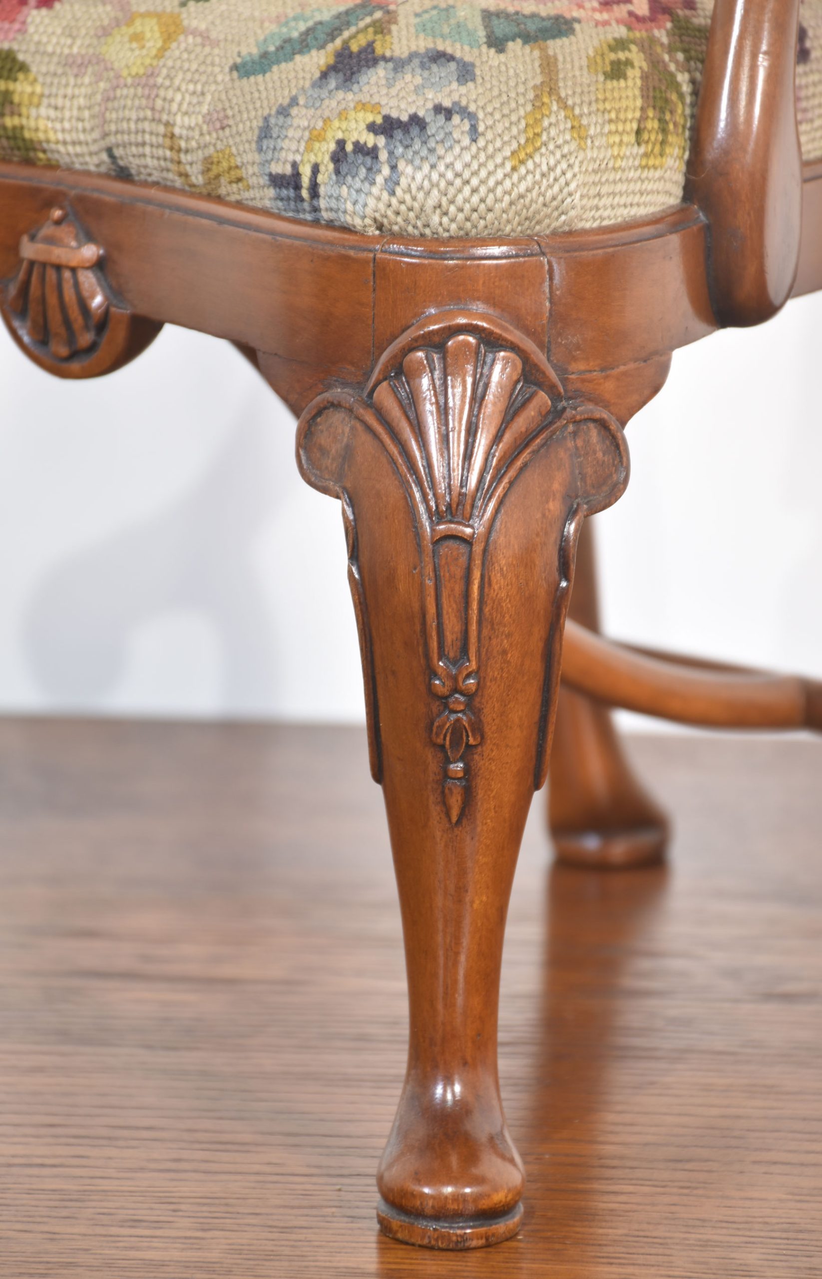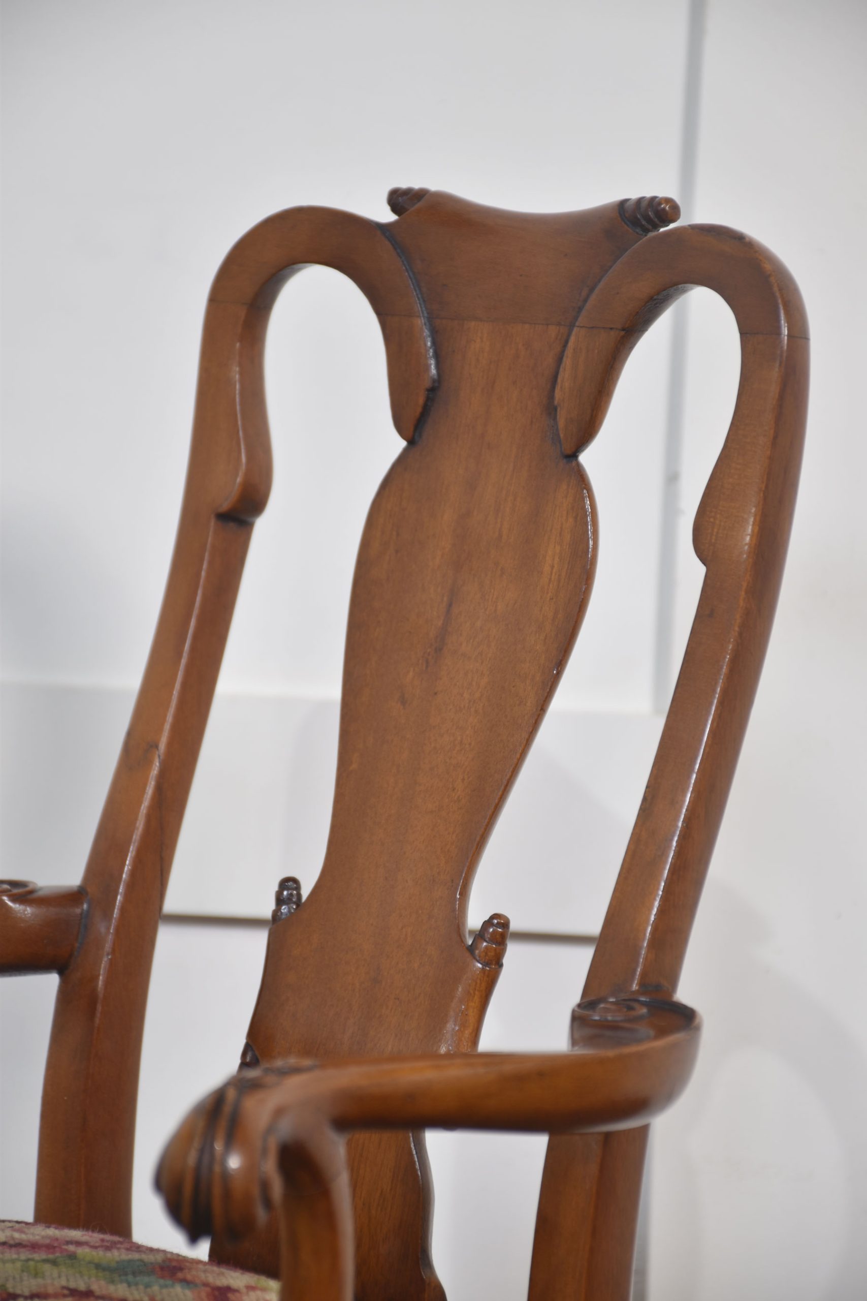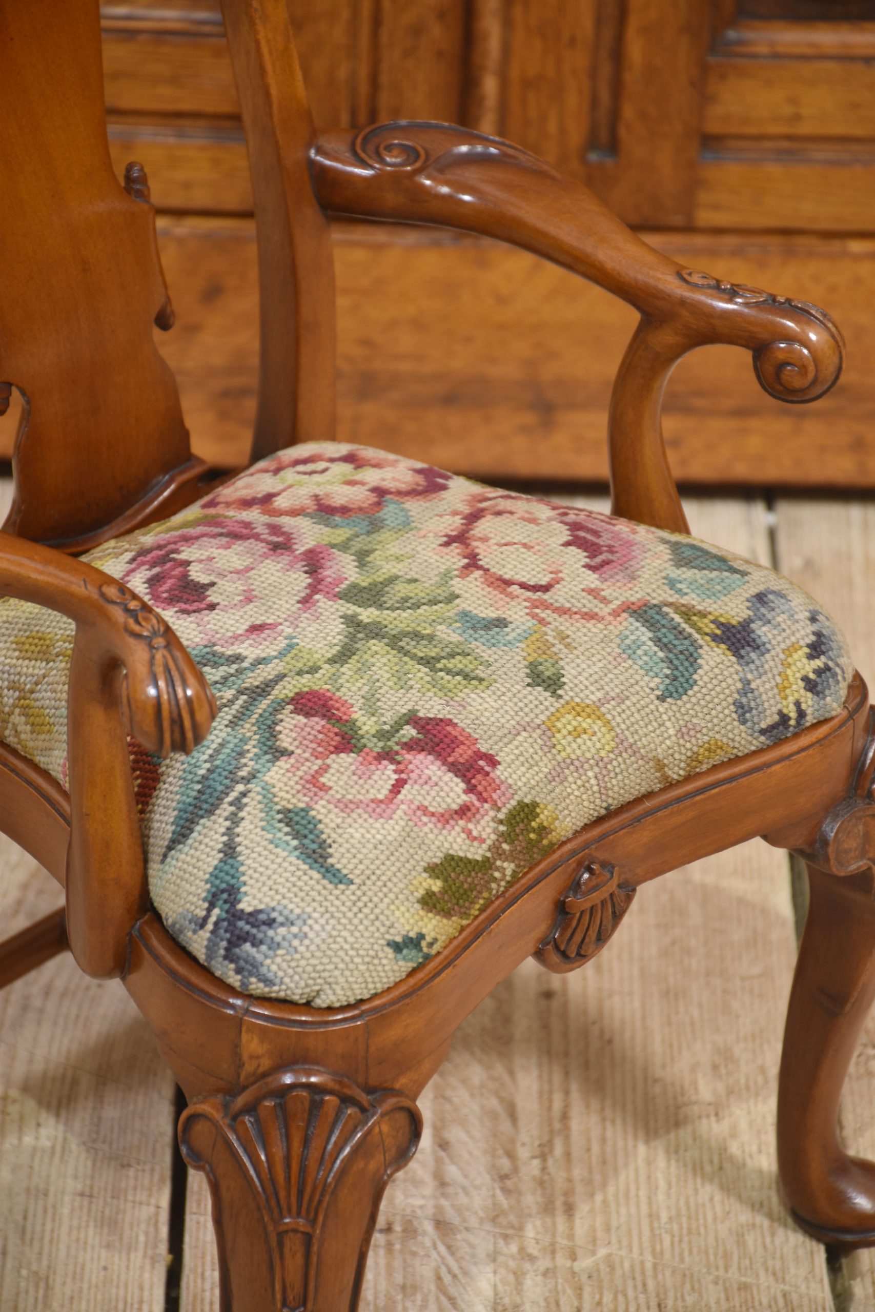 19th-century walnut child’s armchair the shaped back with a central splat to the needlepoint removable seat cushion, enclosed by outswept arms. All raised up on shell-capped carved cabriole legs terminating in pad feet.