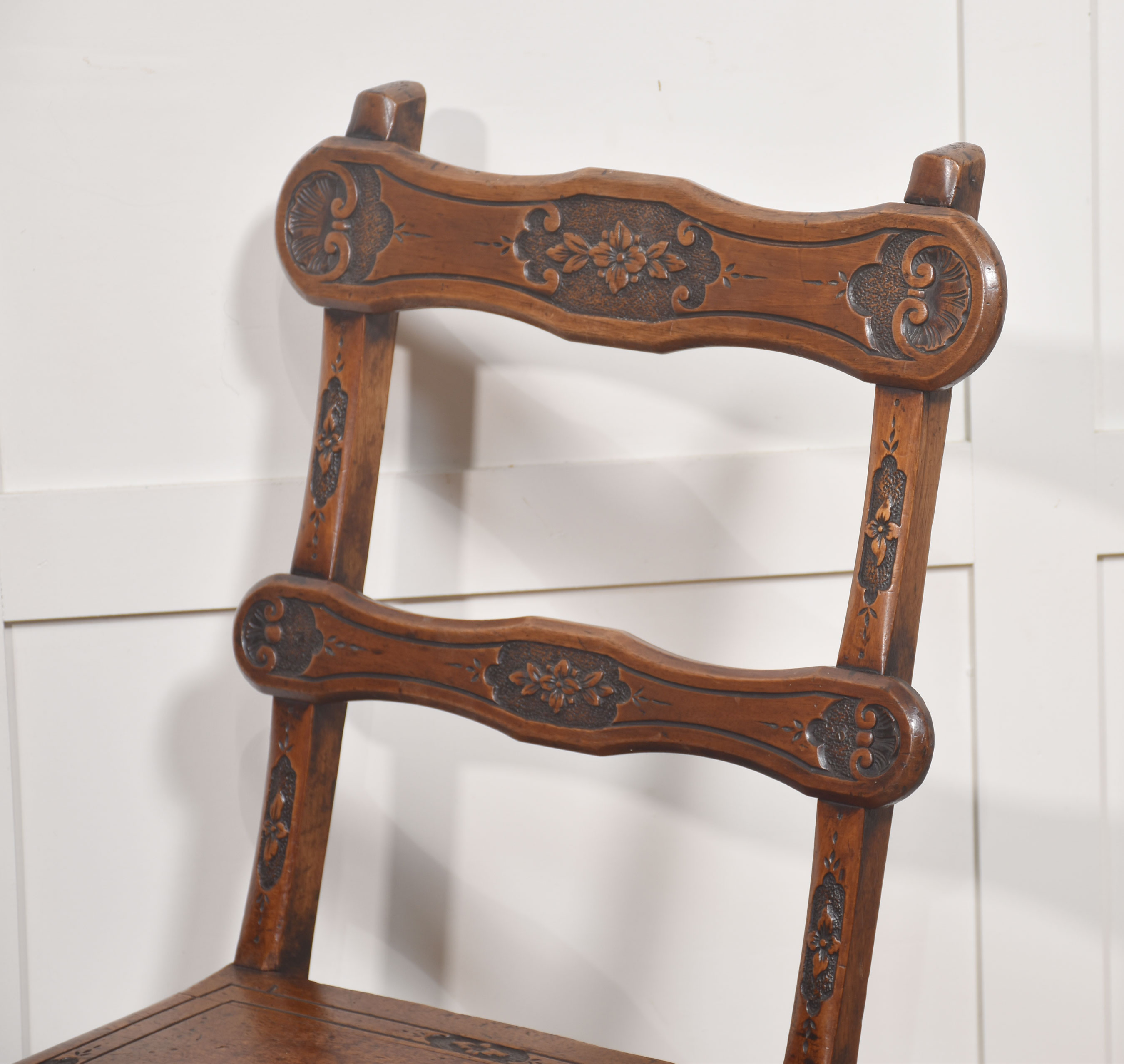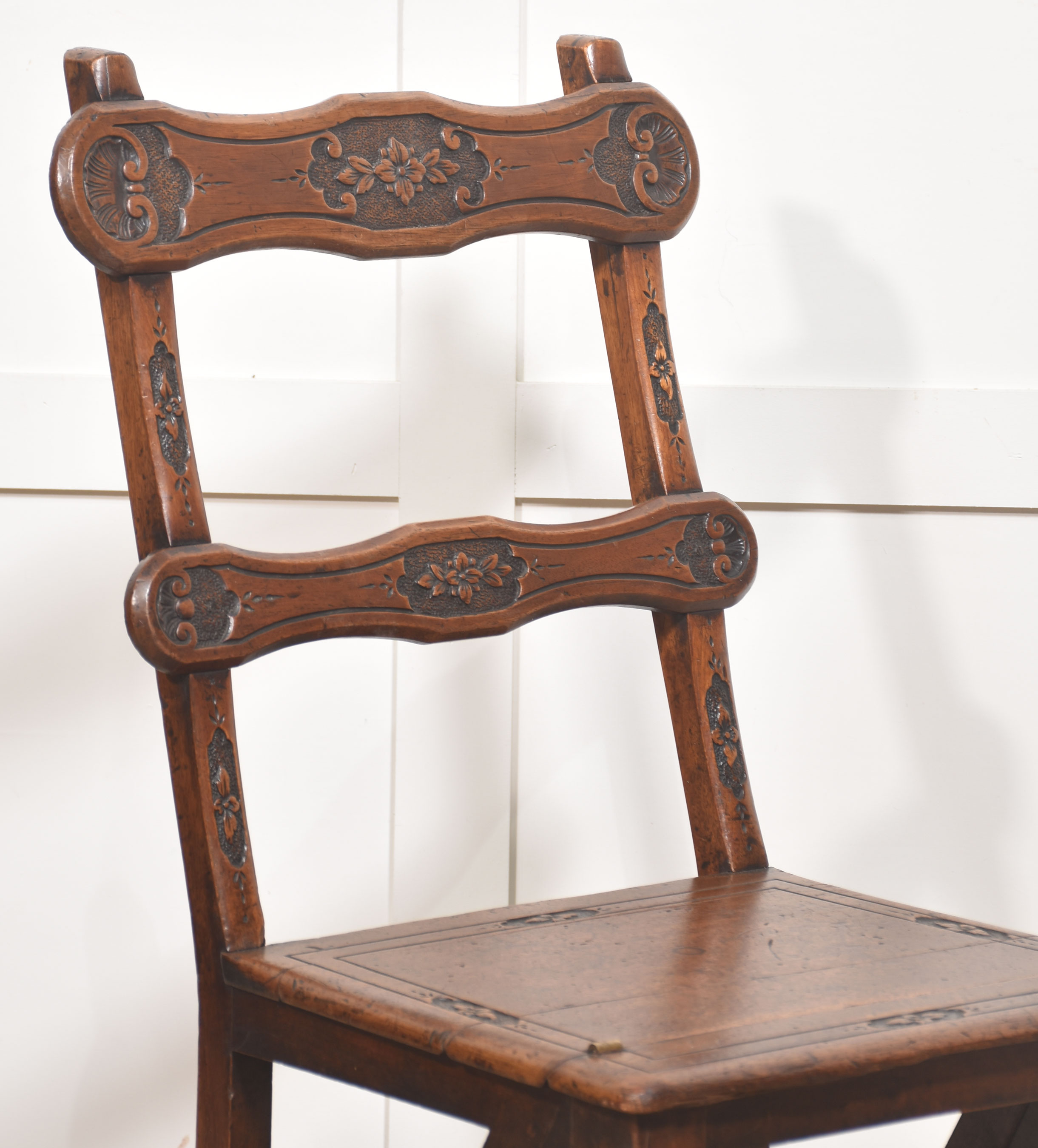 The shaped ladder-back features two carved horizontal splats adorned with floral and foliate motifs, echoed by further incised decoration to the uprights. The solid seat, with moulded edge and subtle line inlay, rests above turned front legs with carved detailing, united by a useful intermediate shelf that forms part of the step structure when opened. The rear supports extend into splayed rails, providing stability in both chair and step configurations.