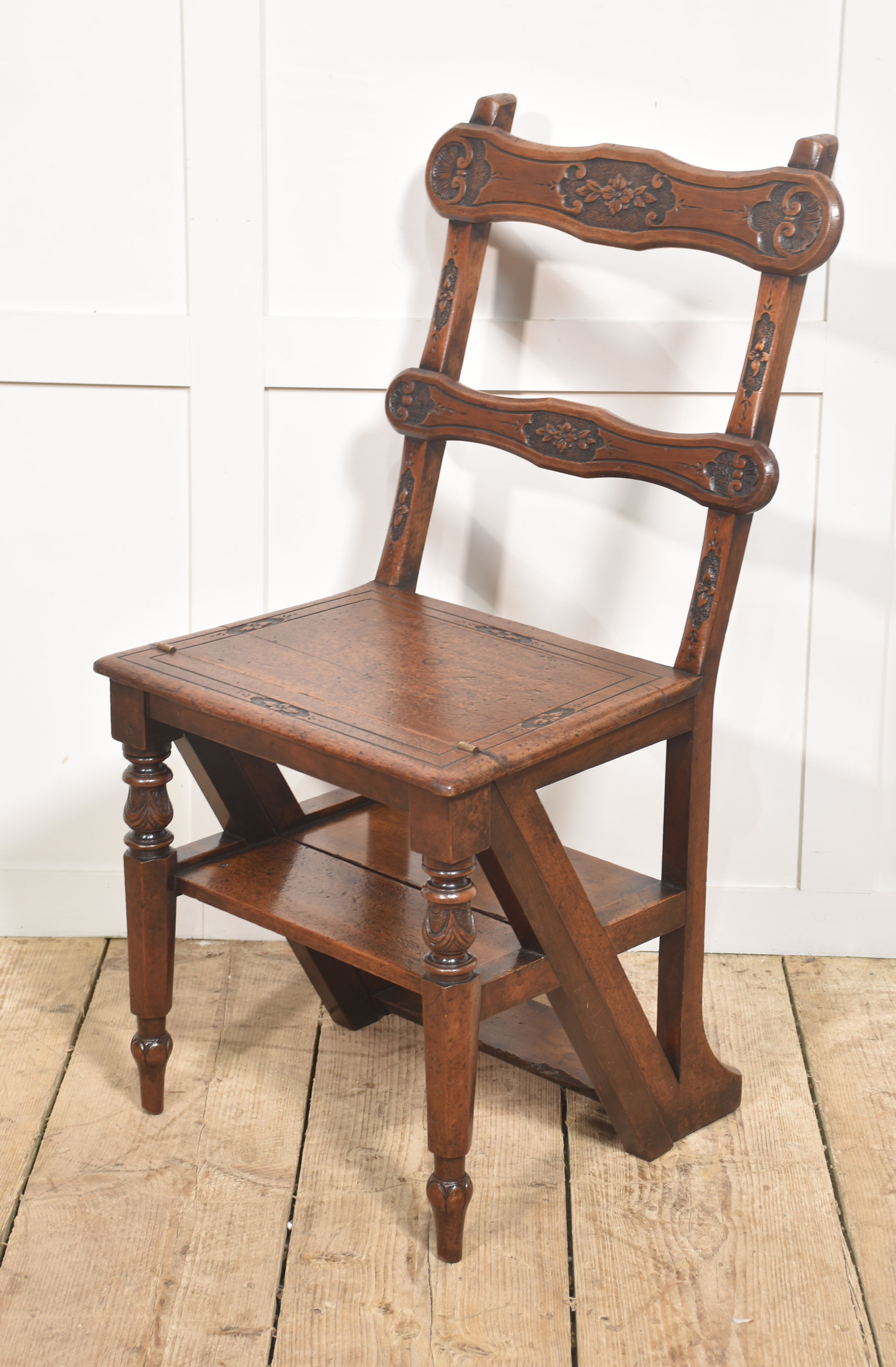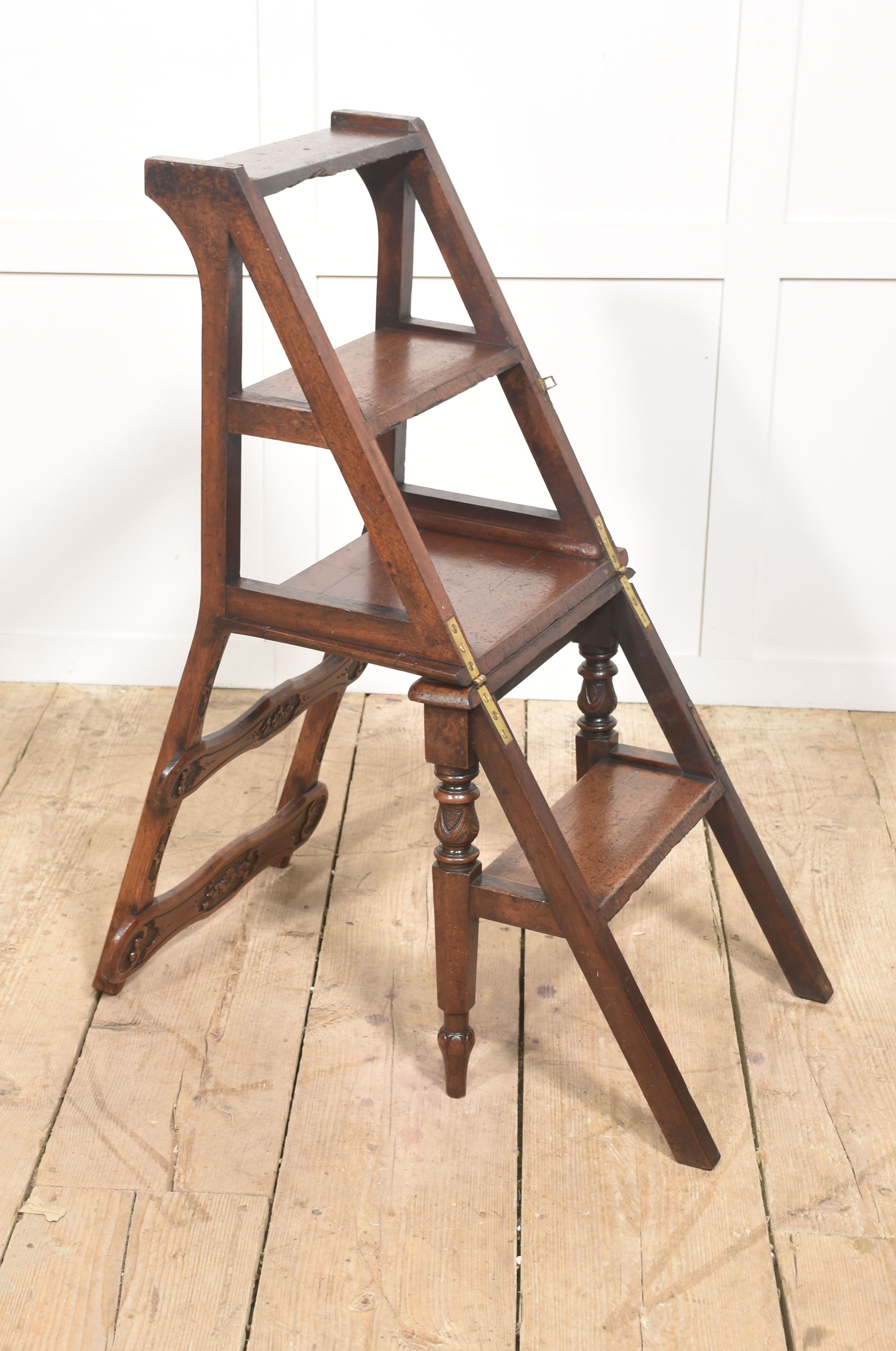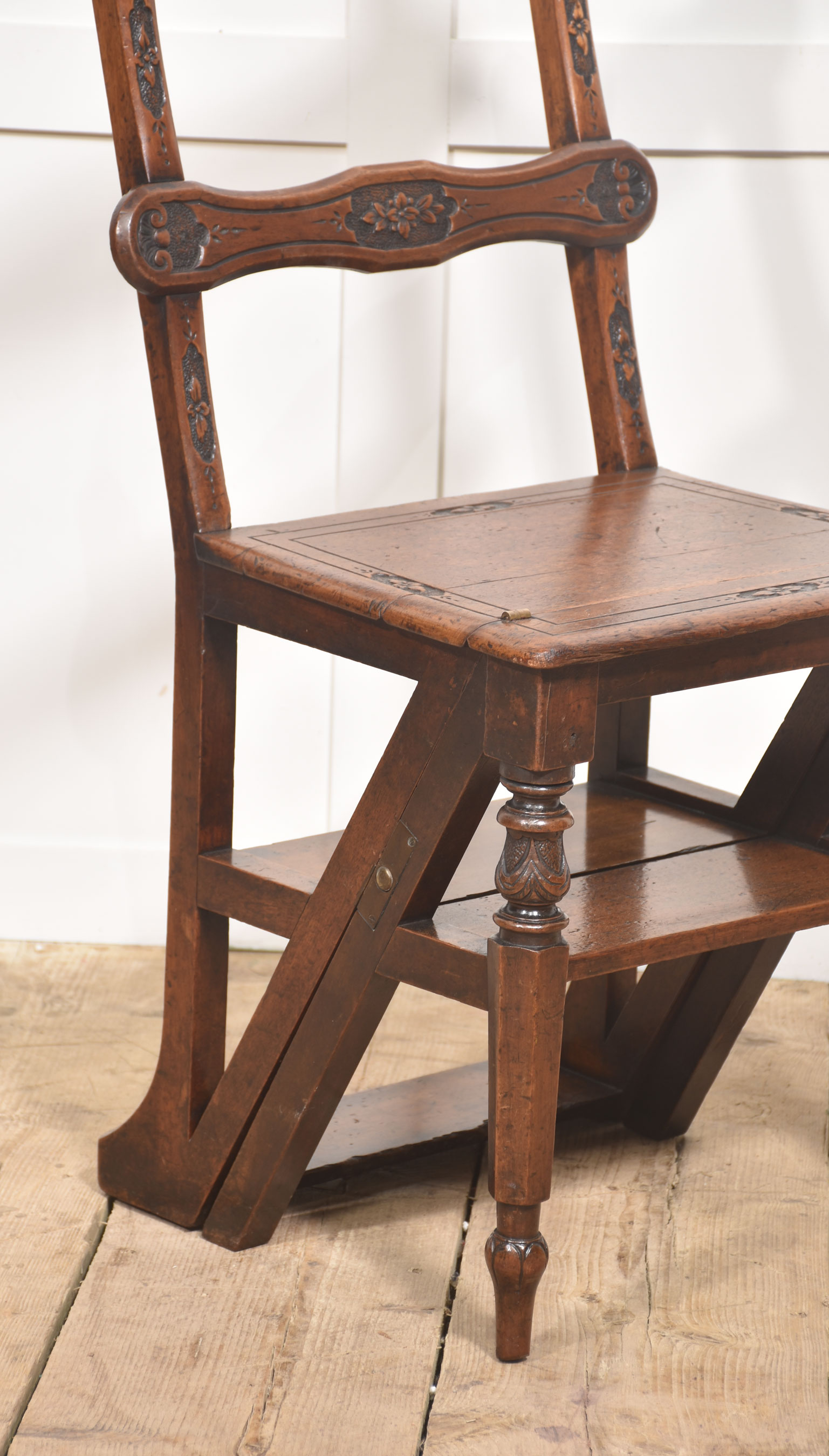 A well-crafted and versatile Victorian walnut metamorphic library chair, dating to the late 19th century. Designed with both practicality and decorative appeal, the chair easily converts into a set of library steps via a hinged and folding action, revealing two graduated treads supported by sturdy side frames with brass hinges.