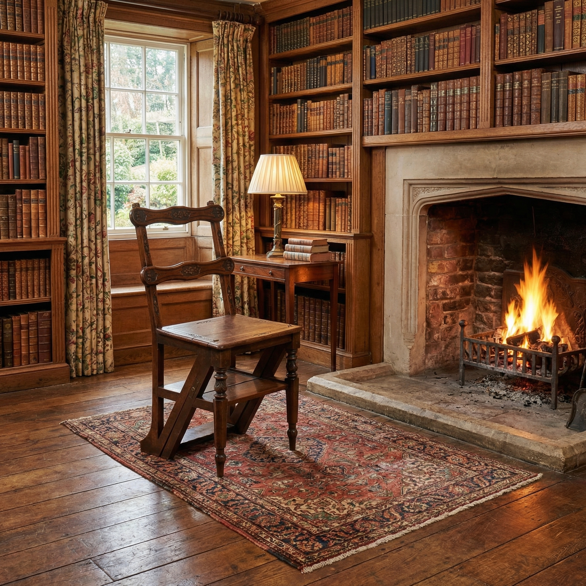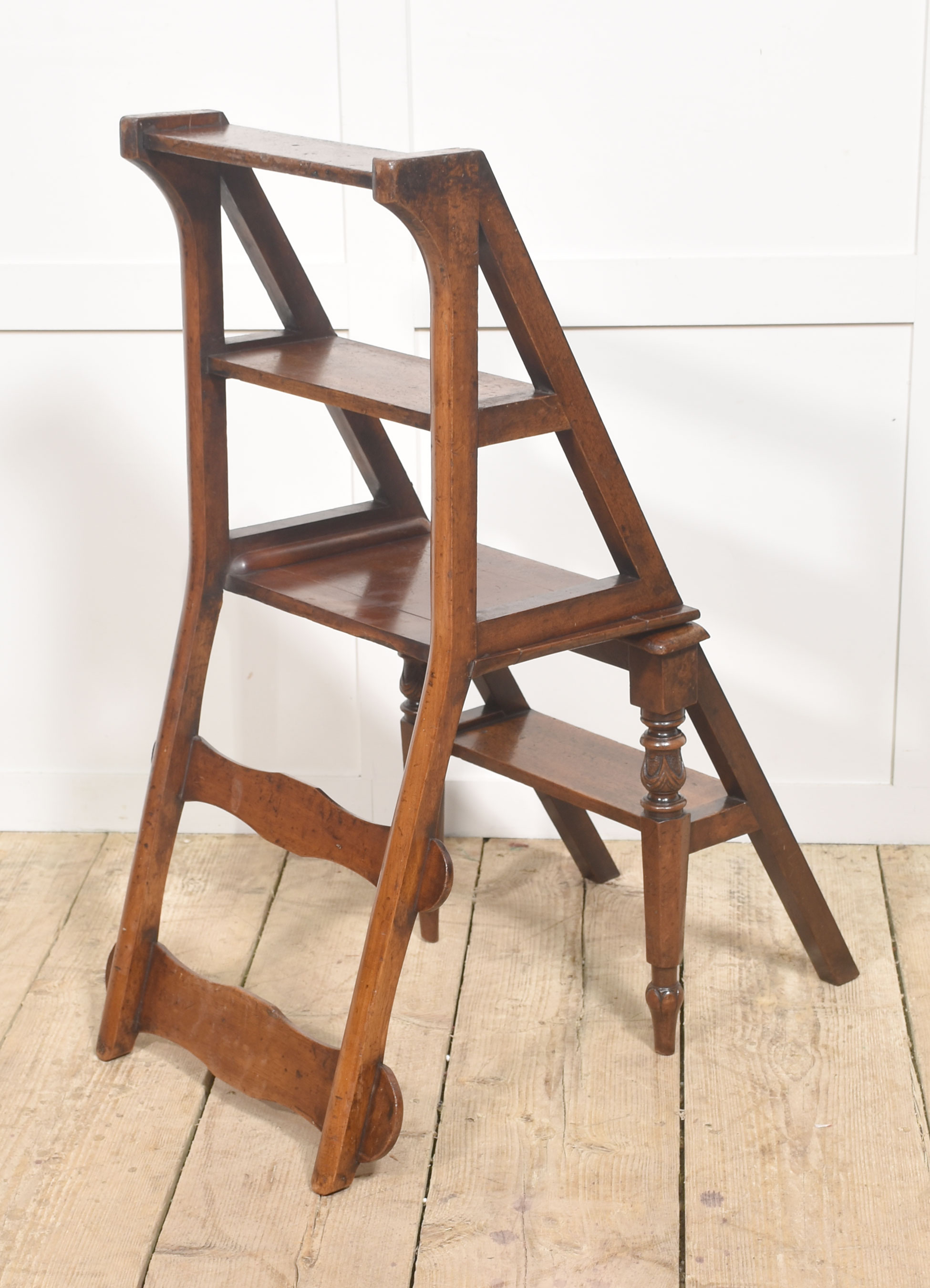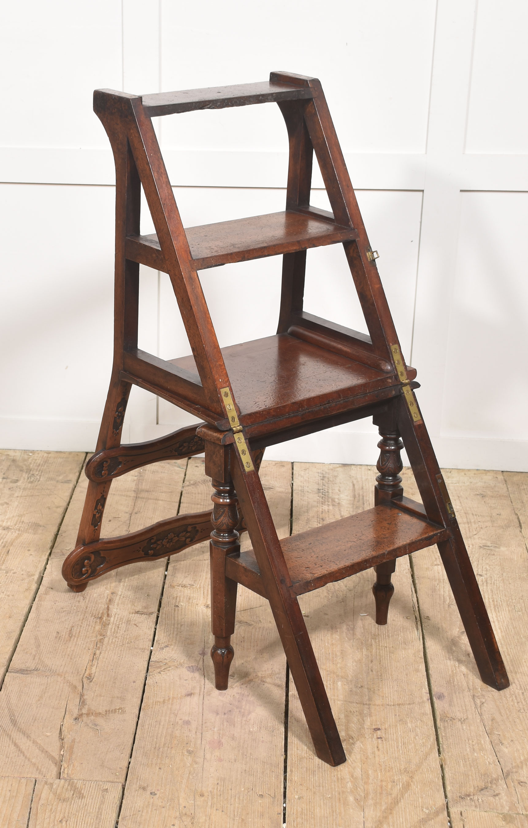 A well-crafted and versatile Victorian walnut metamorphic library chair, dating to the late 19th century. Designed with both practicality and decorative appeal, the chair easily converts into a set of library steps via a hinged and folding action, revealing two graduated treads supported by sturdy side frames with brass hinges.