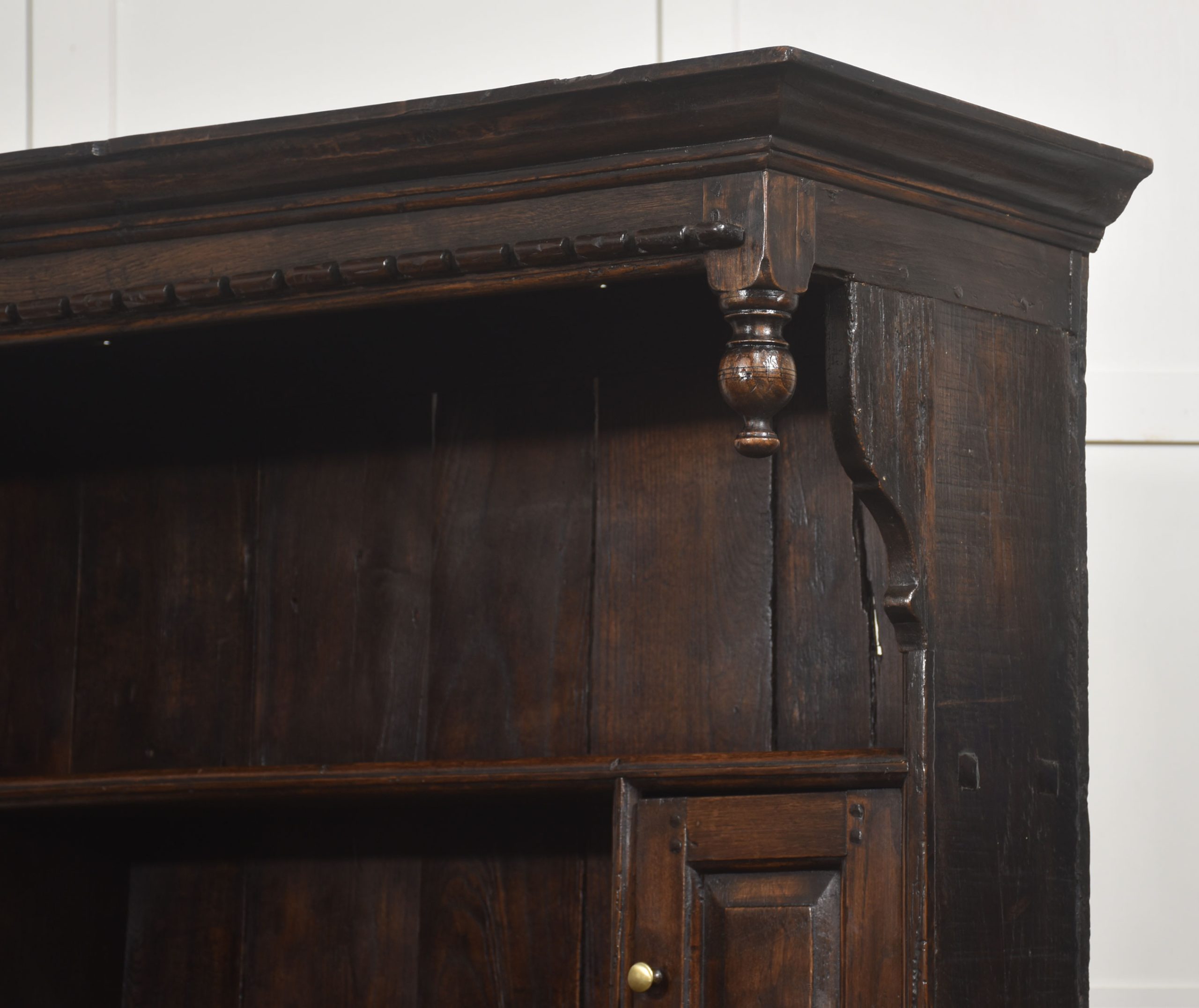 A substantial Welsh oak dresser and rack, probably South West Wales, dating from the late 18th or early 19th century. The rack is surmounted by a broad moulded cornice with dentil-style detailing and turned pendant drops, above open plate shelves with a boarded back. A central open compartment is flanked by small panelled cupboard doors, providing useful enclosed storage alongside display space.