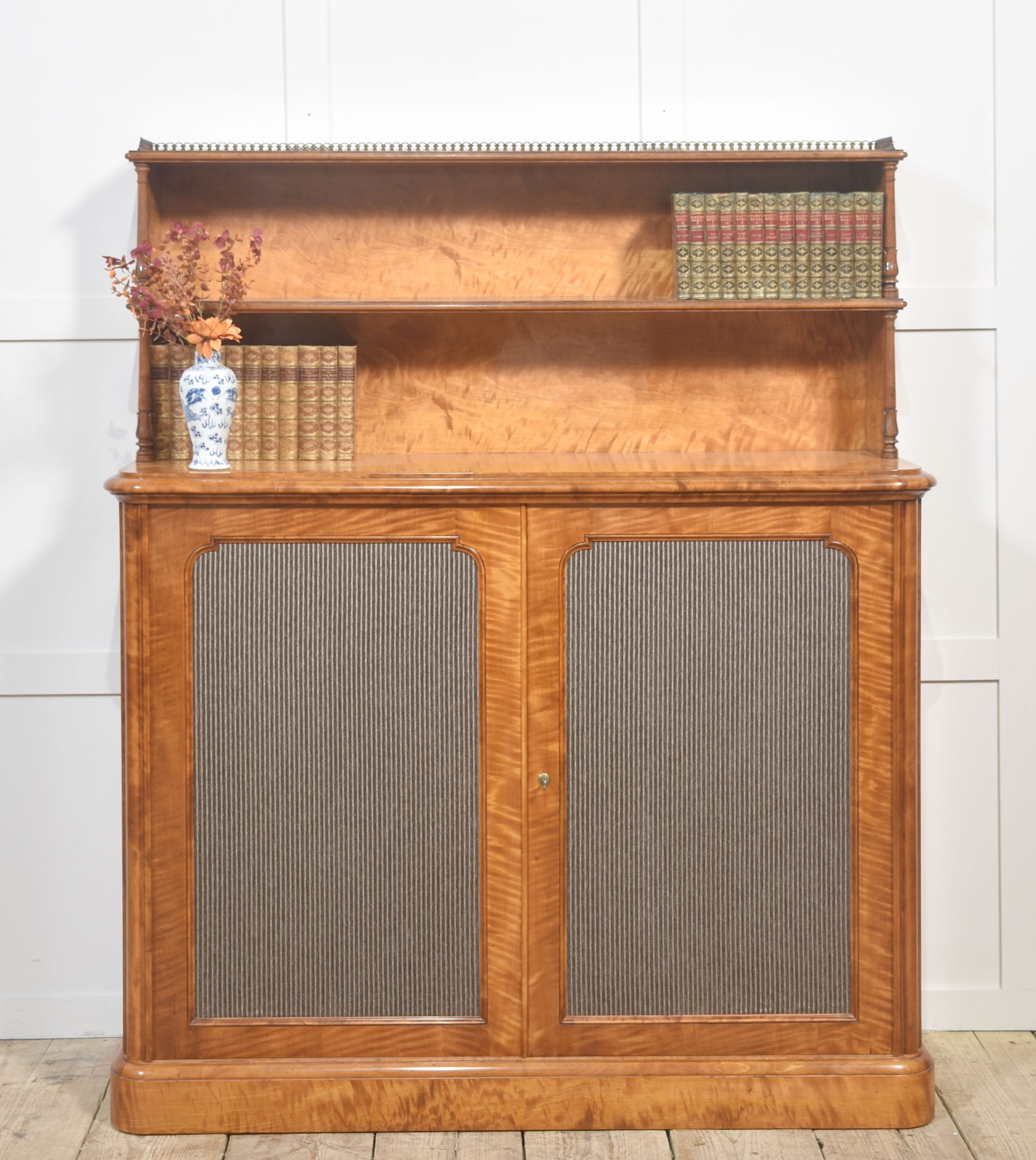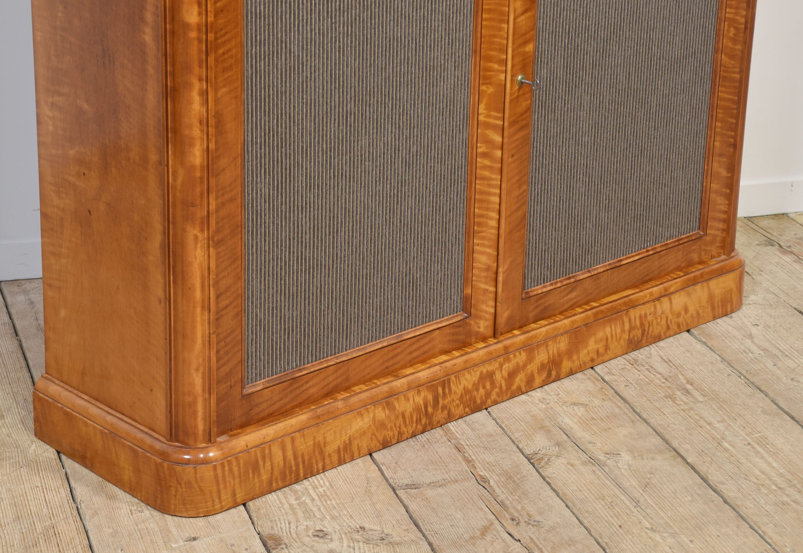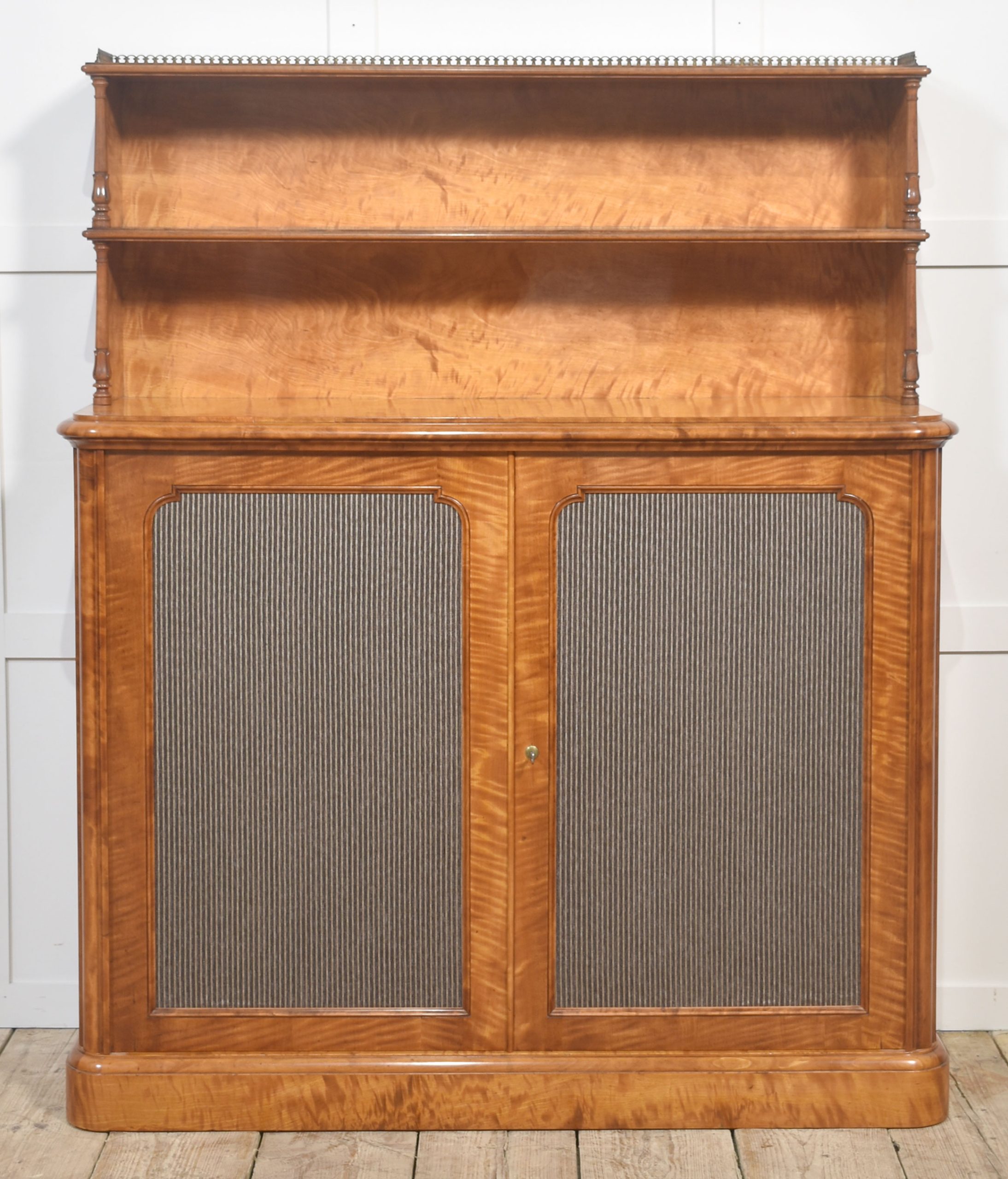 The lower section comprises a pair of paneled doors with finely striped fabric inserts, opening to reveal a spacious shelved interior for ample storage. The doors are fitted with a Bramah lock and working key, a hallmark of quality craftsmanship from this period.