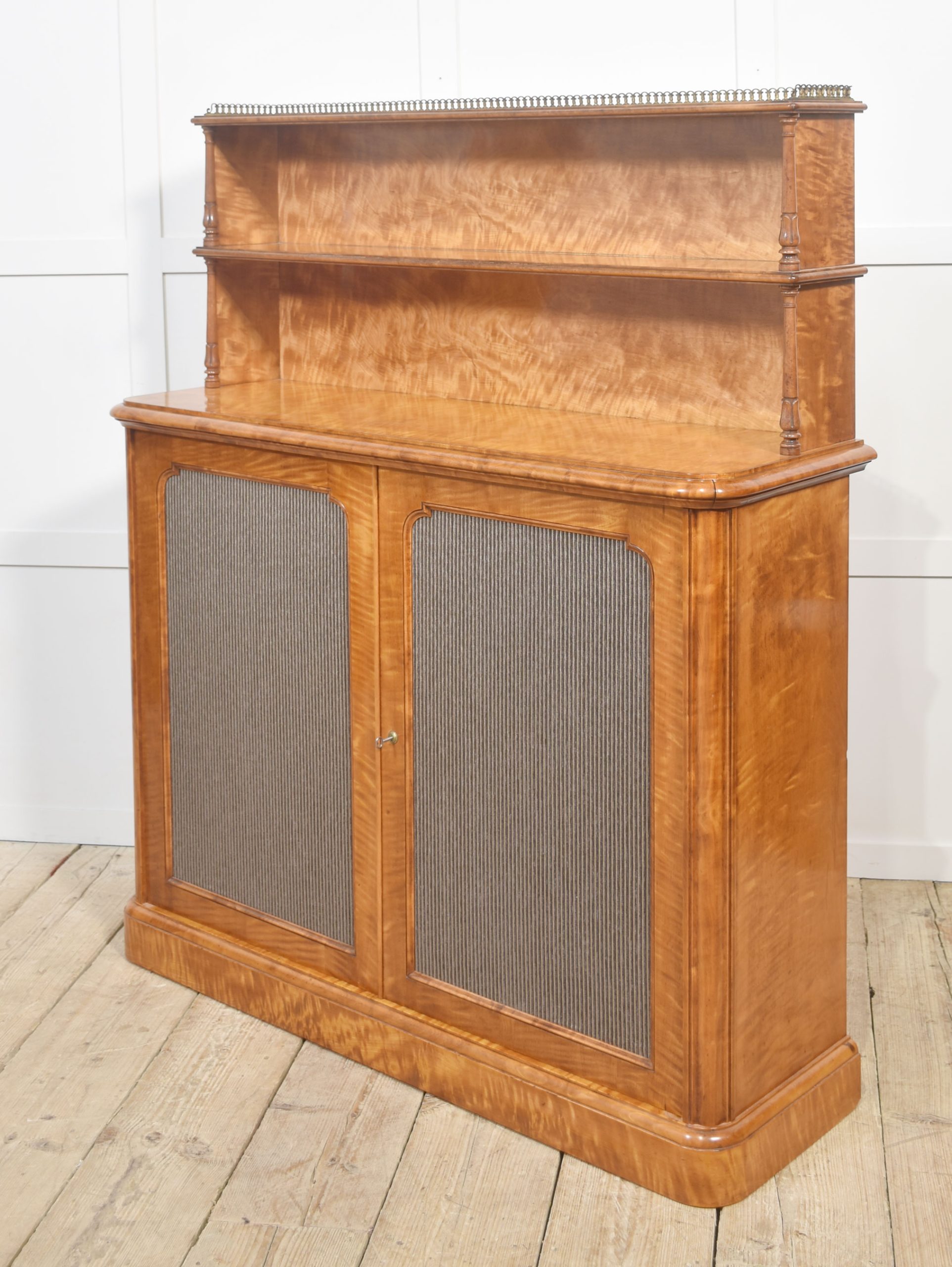 A superb William IV period chiffonier, beautifully crafted in richly figured maple with a lustrous hand-polished finish that enhances the natural depth and movement of the grain. The upper section features two open display shelves supported by elegant turned columns and finished with a fine brass gallery, ideal for displaying books or decorative objects.