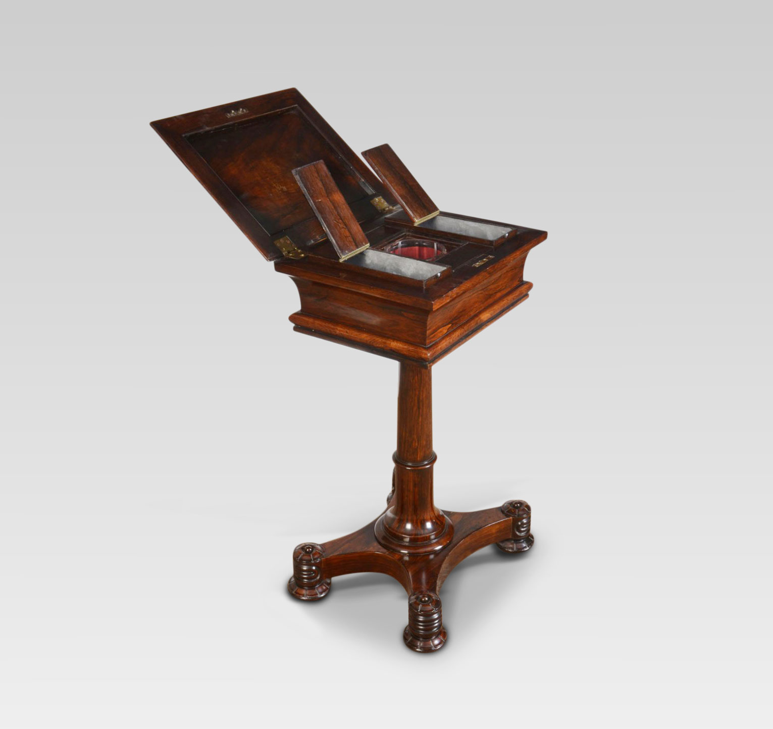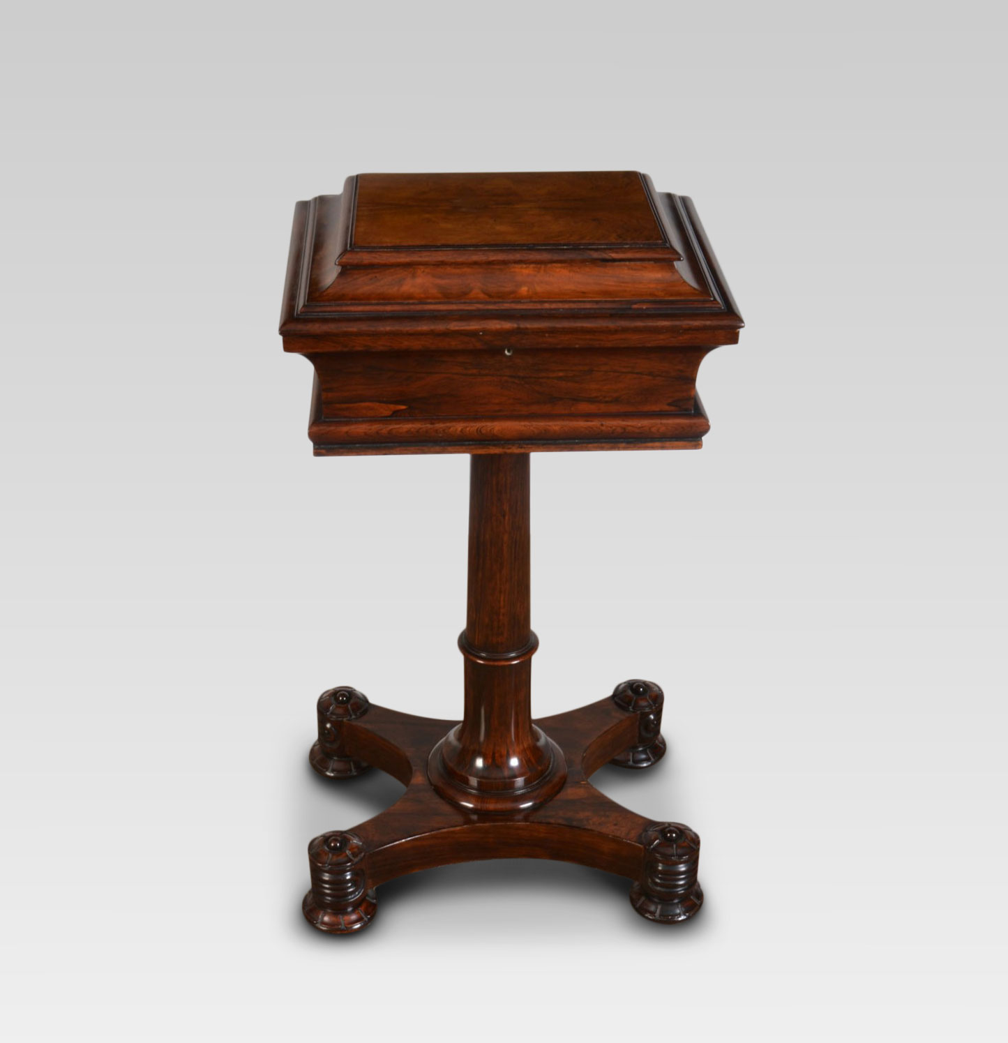 Rosewood teapoy on stand. The raised rectangular top opening to reveal a fitted interior with two lidded tea caddies which have been lead lined and sugar basin. All raised up on a circular column and quadruped base terminating in turned feet.