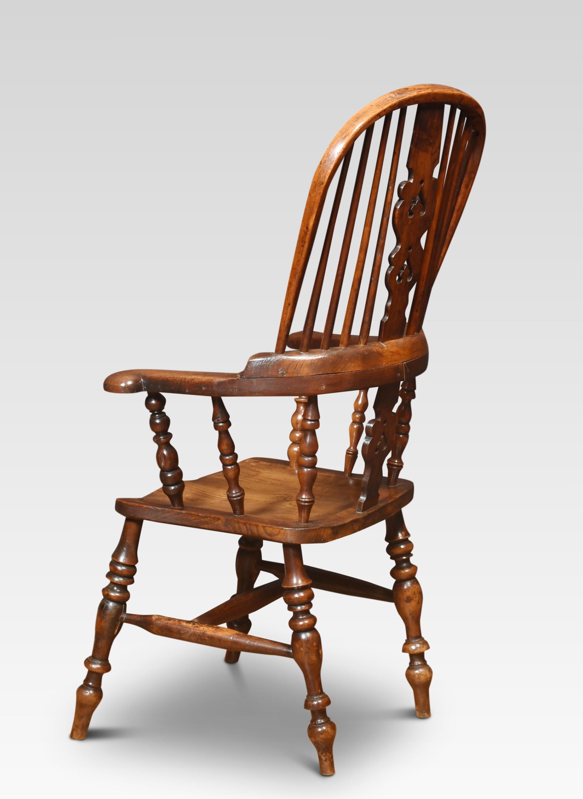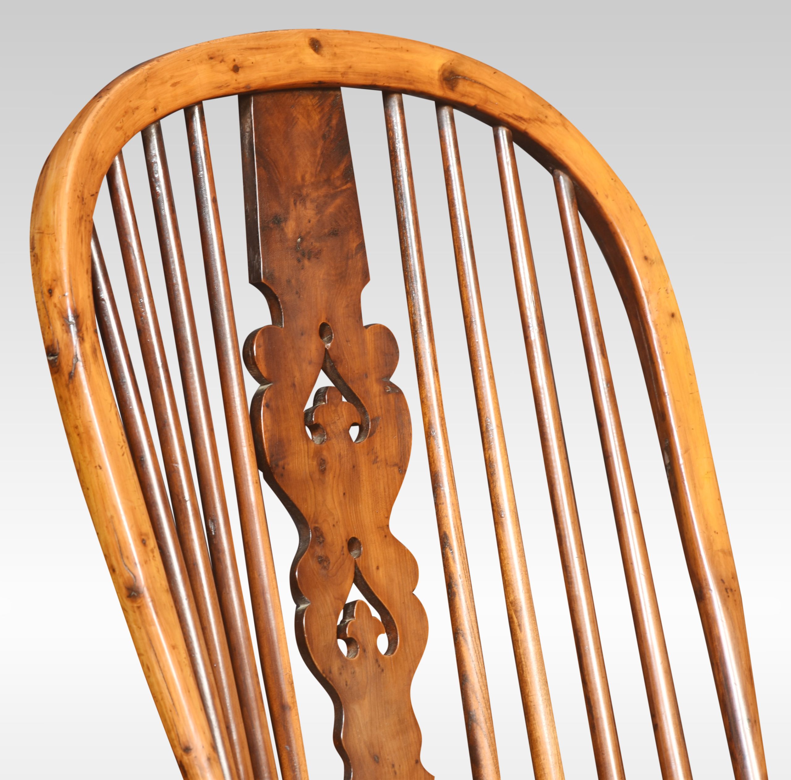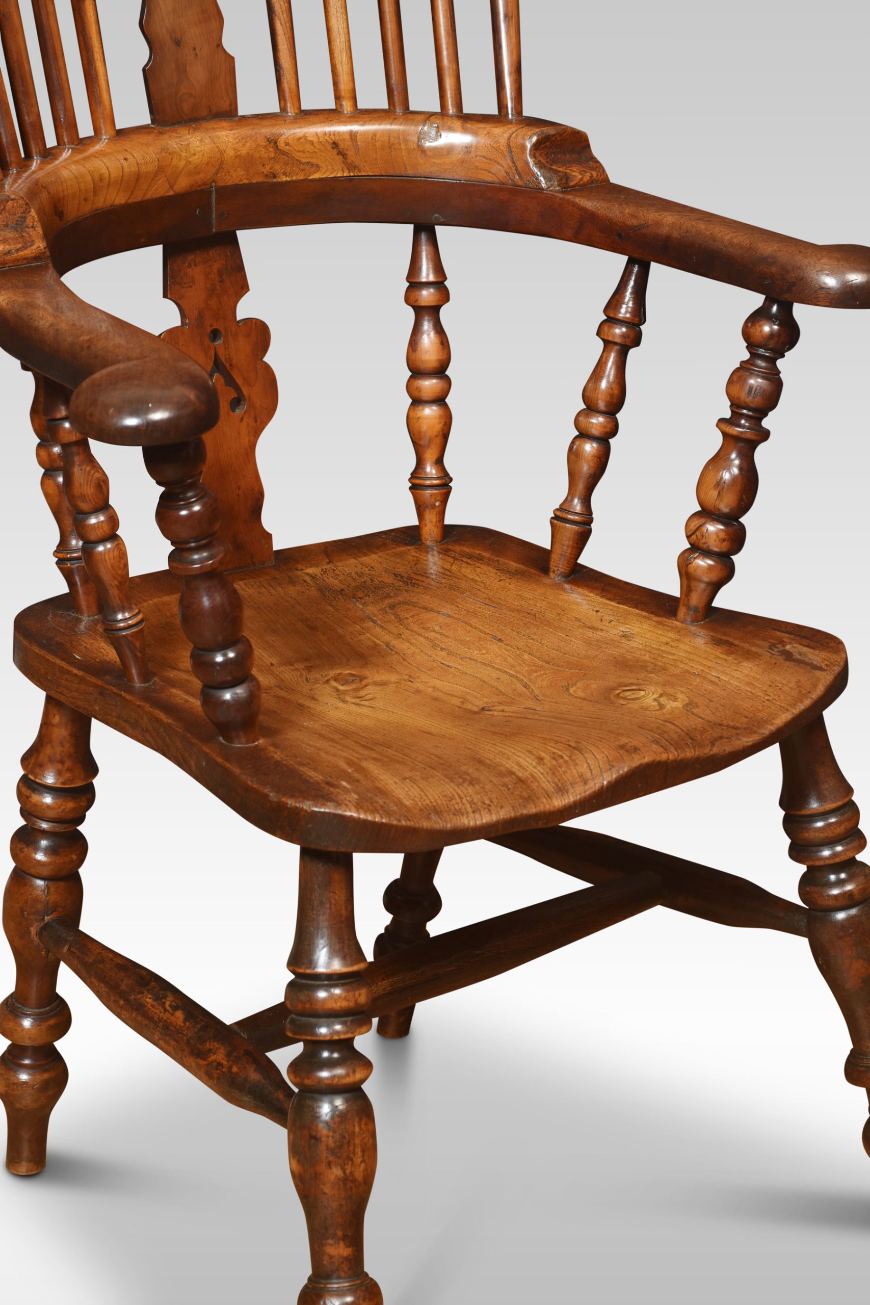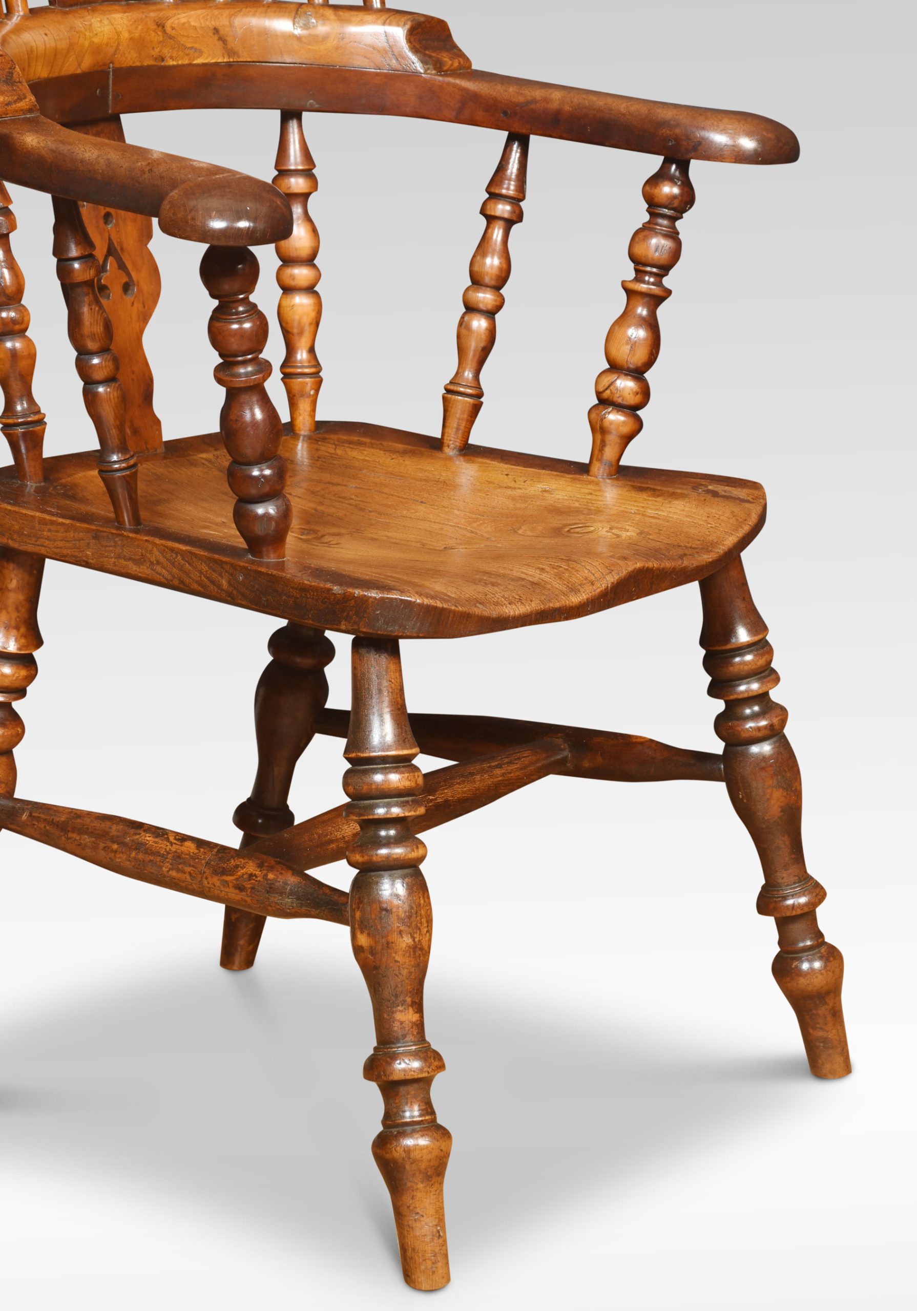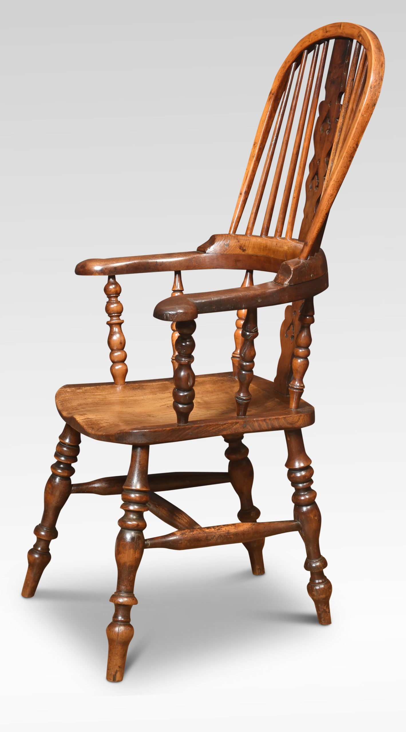 19th-century yew wood broad arm Windsor chair, the hoop back with a pierced and shaped central splat above ash seat surrounded by scrolling arms. Raised up on turned legs united by stretchers.